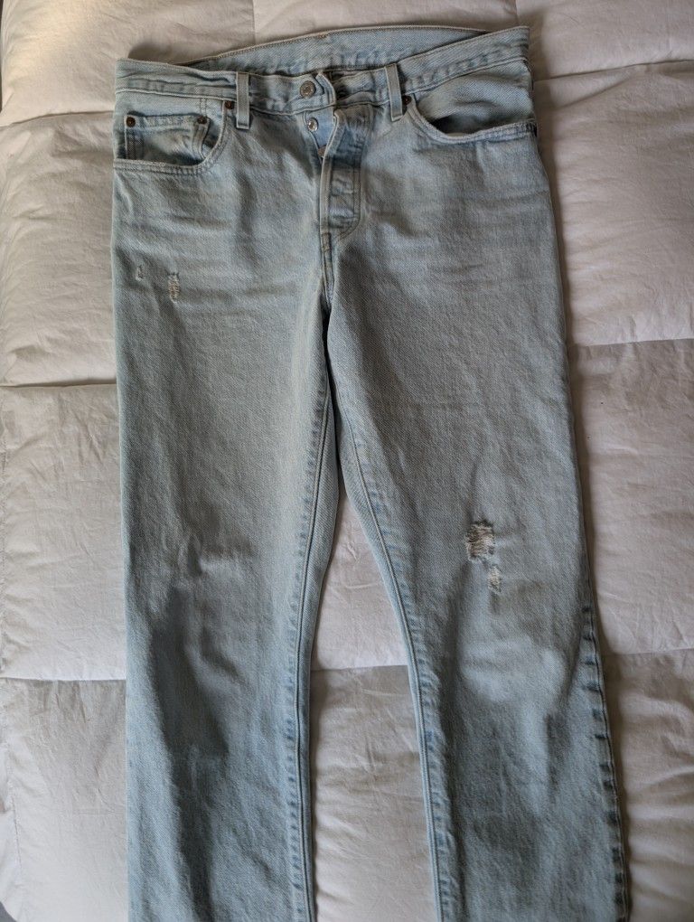 501skinny, w 32 L32, straight cut jeans. Has a few red spots, see pictures that might be an easy fix. I haven't tried and with very few times.