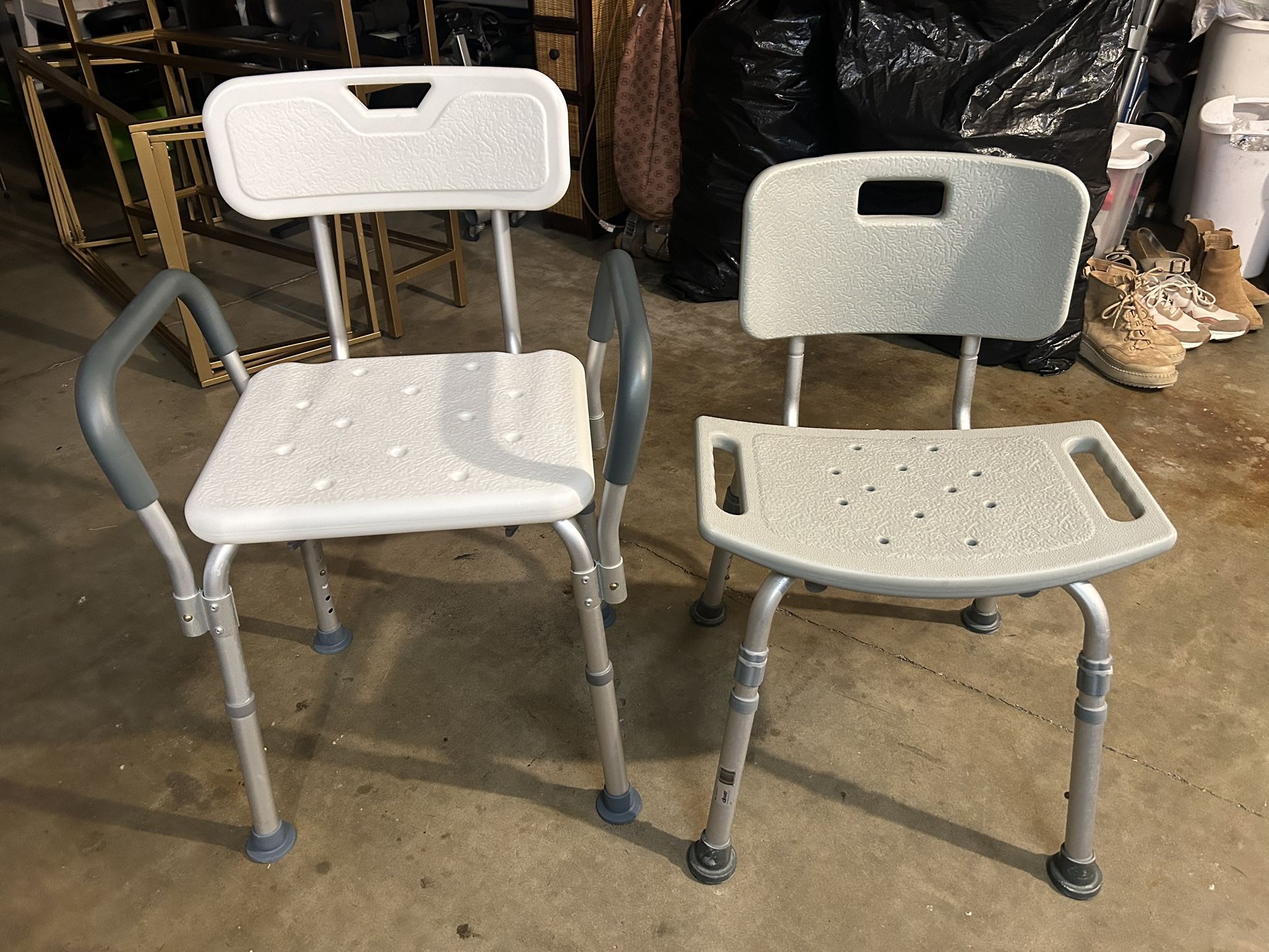 The Deluxe Aluminum Shower Bench with Back is like new condition and has adjustable legs. Bathroom bench with arms $15 Grey one with no arms $10 It has a sturdy aluminum frame that resists corrosion. The curved seat is slip-resistant and features drainage holes to prevent water pooling. The legs are height-adjustable to accommodate different users. The seat has handles for easy transfer in and out of the shower or bath. It is medical-grade rated for use in hospitals and nursing homes. Chair, stool