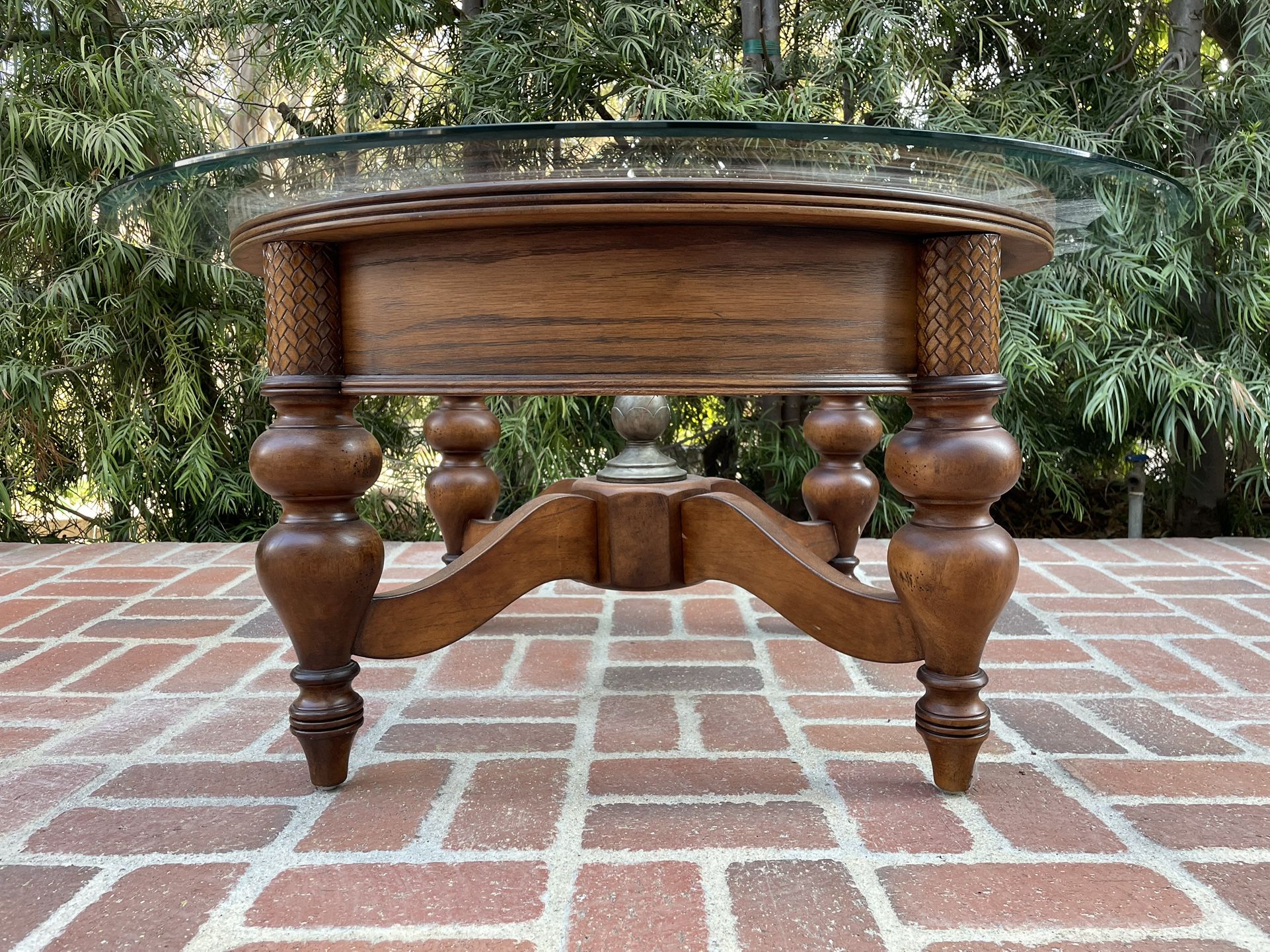 Stained Wood base with glass top. Beautiful coffee table! See pictures for measurements and details.