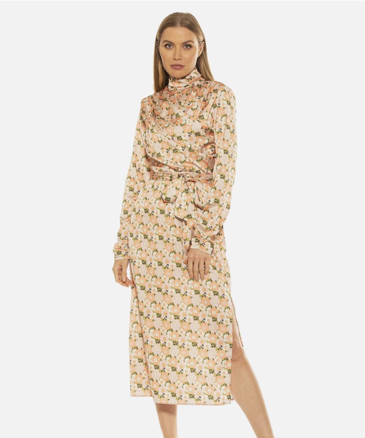 With tags Missing belt but not needed Side leg slits Mock neck Back upper buttons and lower zip Satin effect