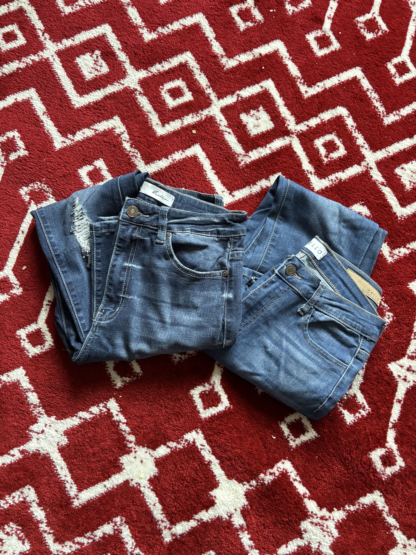 Two High waisted skinny jeans One’s a size 9 and the other an 7 but they both fit like 7s i’m trying to get these out of my closet lol