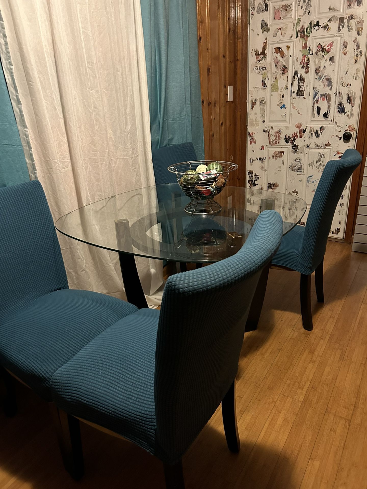 Five piece dining room set with glass table for Chairs. The chairs in this photo is covered with chair covers. They are multicolor. Chairs must go immediately.