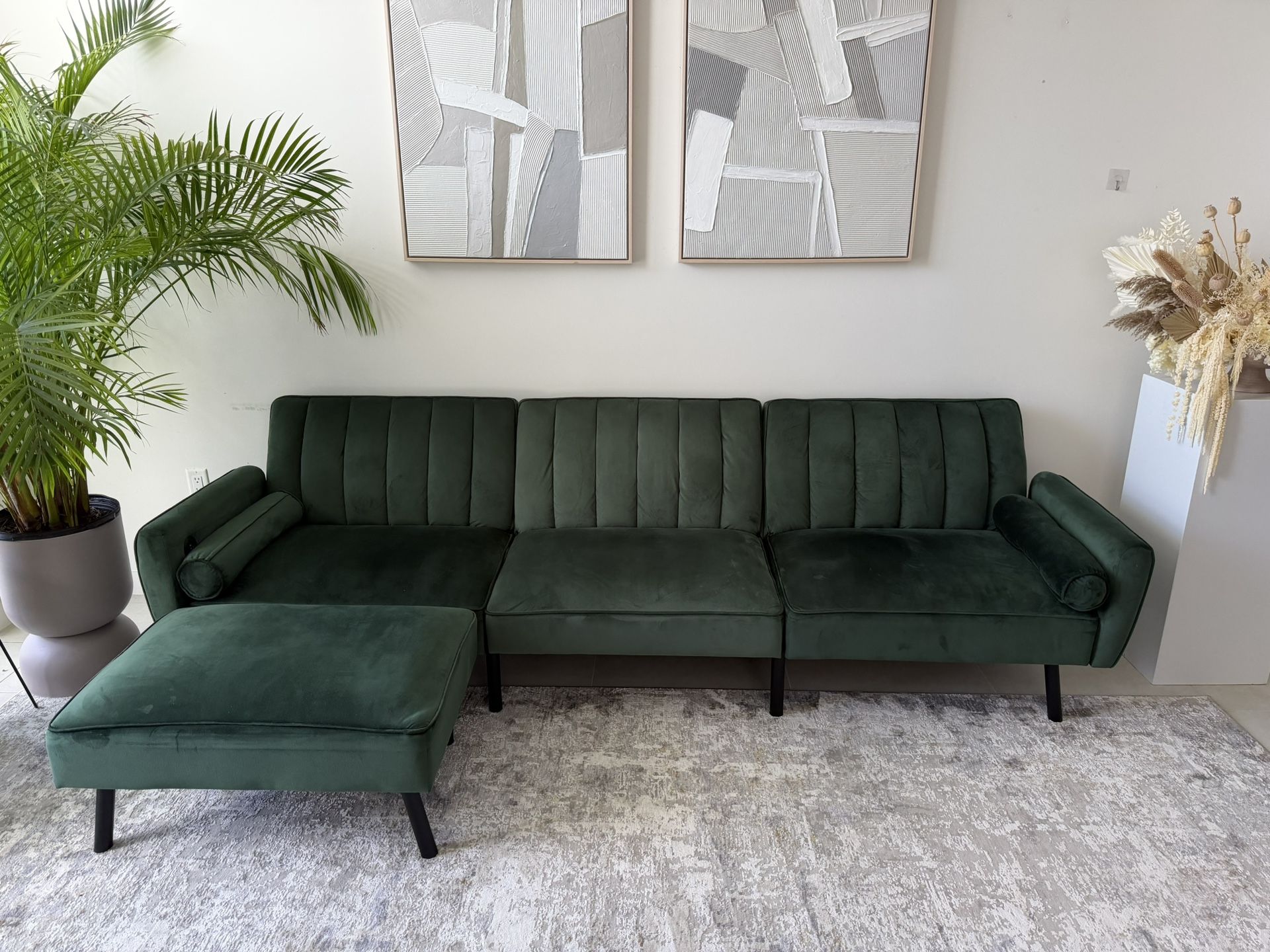 Width 107” Depth 33” Height 31” Seating depth 21” Ottoman 33” x 23” x H16” Depth when opened 42” (without ottoman) Pickup only. Fort Lauderdale. I can disassemble it into three pieces + ottoman so you can carry and transport it more easily.