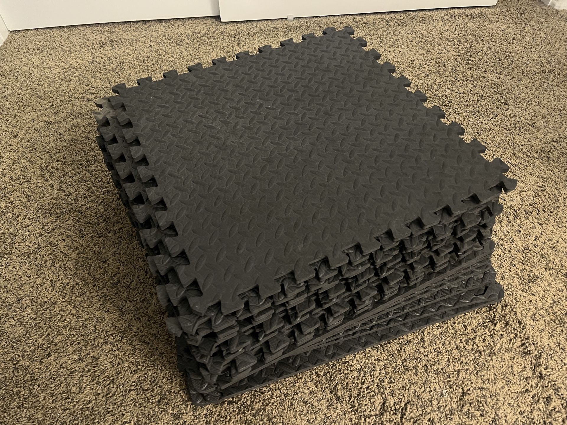 Selling 22 interlocking foam exercise mats (puzzle-style). Great for home gym, garage flooring, kids play area, or workout space. * Durable EVA foam (shock-absorbing) * Interlocking edges – easy to assemble and customize * Protects floors from weights, equipment, and impact * Non-slip textured surface * Lightweight and easy to move/store These are similar to ProsourceFit-style gym flooring mats. Condition: Lightly Used Perfect for: * Home gyms * Weightlifting areas * Garage floors * Playrooms * Yoga / stretching 💲 $60 for all 22 mats Prefer to sell as a bundle, but willing to sell smaller sets.