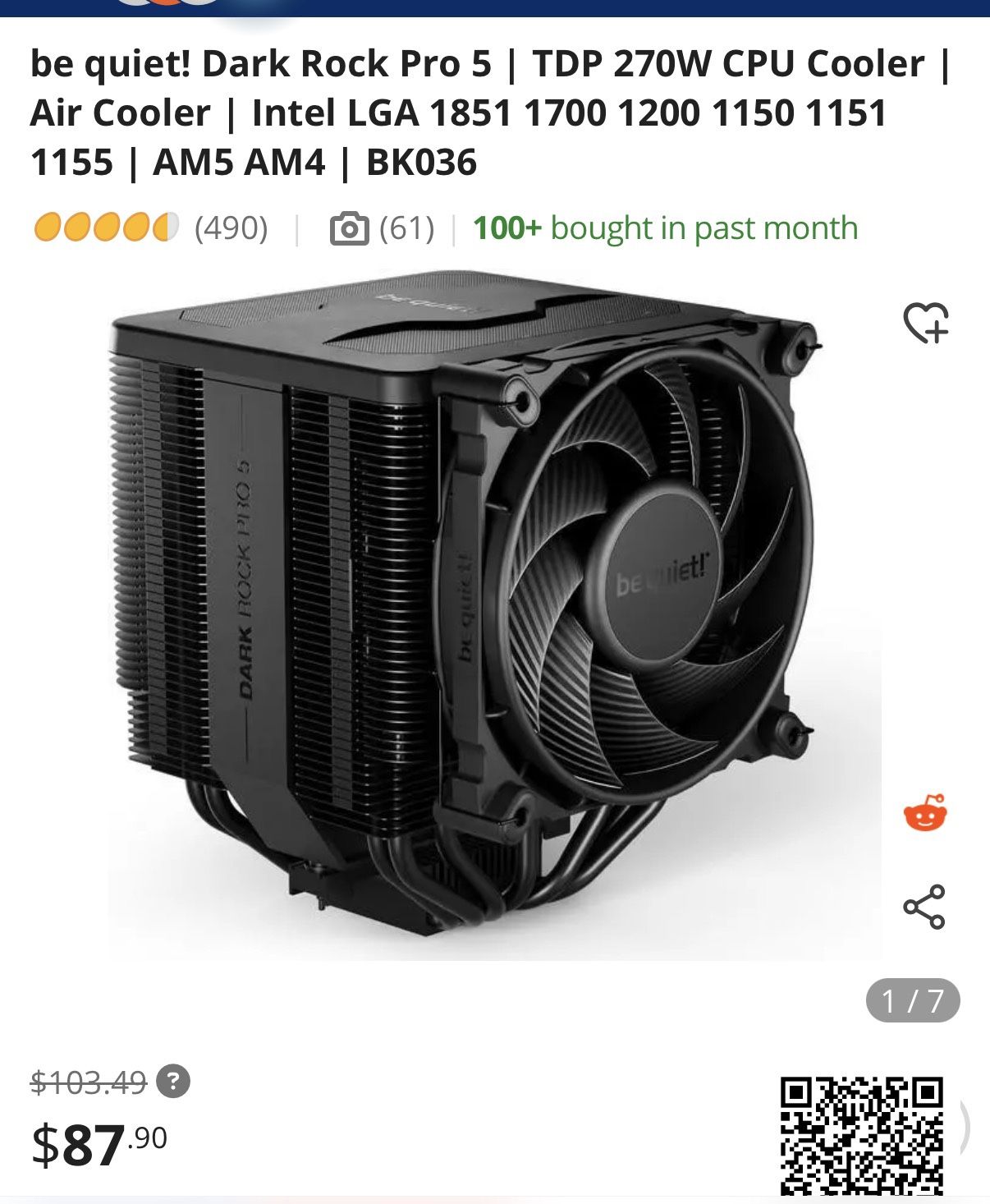 The Dark Rock Pro 5 is rated for 270W TDP, it's used for high End CPUs. Used it to cool my 7800x3d CPU and never reached 70 degrees with PBO/Undervolt settings I have all hardware included for AM4/5 and Intel installation brackets CPU contact plate is stained from thermal paste it is in perfect condition without any damage