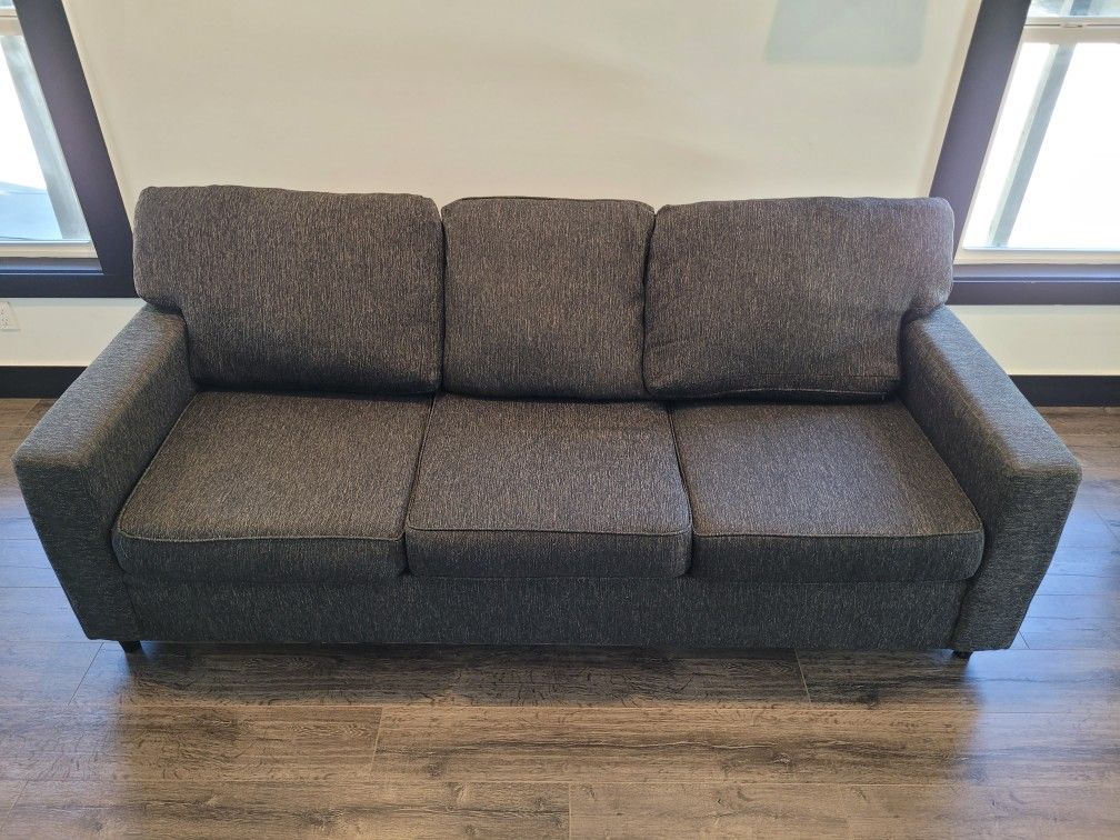 By Raquel sofa chace Piasso Magic in Slate Grey Fabric 91" Sofa | Track Arms | Loose Reversible Back. Excellent condition, no stains, no tears or scuffs, like new.