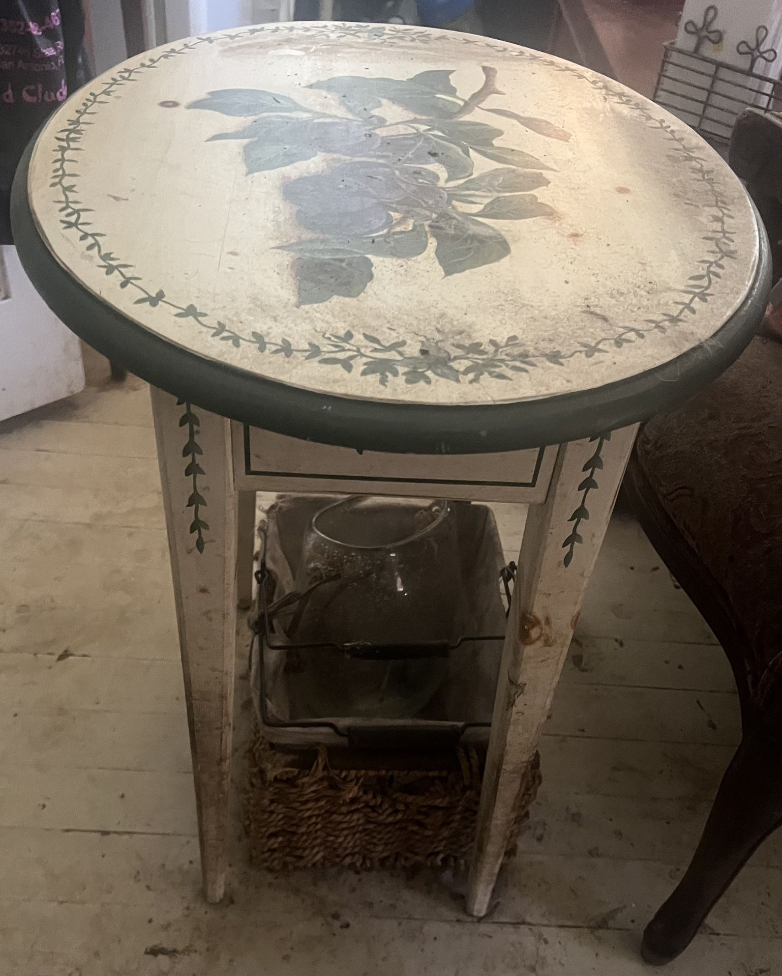 Hand-Painted Plum Motif Round Accent Table – Vintage Country Cottage Style