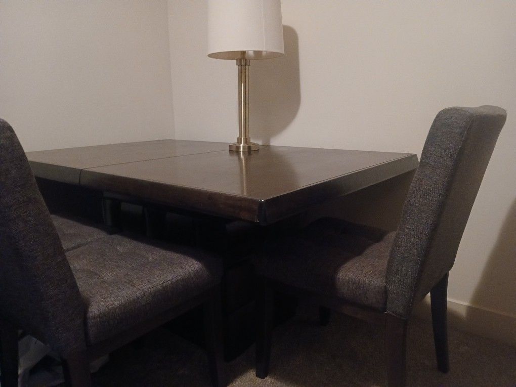 Dark wood table with gray fabric chairs, seats 6. It has a leaf that extends the table. Table, leaf and all 6 chairs are in good condition. It separates into 2 pieces to move. Table is 63 x 41 w/out the leaf, 81 x 41 with leaf, base is 30 x 18. $350 obo