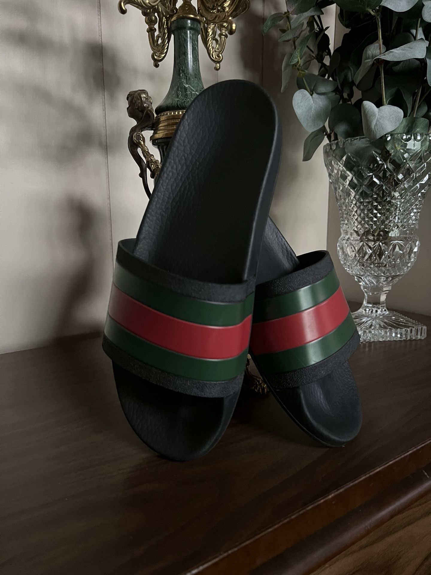 The best and classic Gucci web slides. Bought at Gucci 5th Ave NY. Look at the picture with the laser engraving for authenticity purposes. I just sell original items. The box is for illustrations purposes, that don’t belong to those slides and it is not included. 310.00 +TAX Retail. You can’t find those easily anymore. They are 10G=10UK=10.5US. please be familiar with Gucci sizing. Am selling to buy a bigger size. Wapp 954.465.00.68!