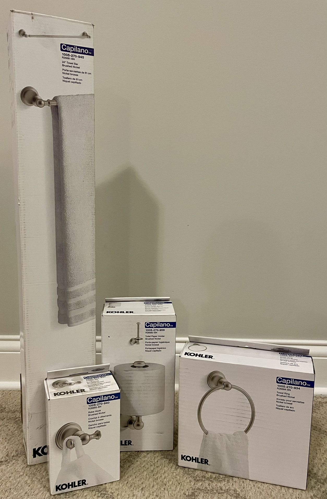 4 sets available. Brand new. Individual prices listed below KOHLER Capilano 24 in. Towel Bar in Vibrant Brushed Nickel- $25 KOHLER Capilano Towel Ring in Vibrant Brushed Nickel- $25 KOHLER Capilano Toilet Paper Holder in Vibrant Brushed Nickel- $15 KOHLER Capilano Robe Hook in Vibrant Brushed Nickel- $15 *Premium metal construction for durability and reliability *KOHLER finishes resist corrosion and tarnishing *Lifetime limited warranty *Installation hardware included *Coordinates with all other products in the Capilano collection