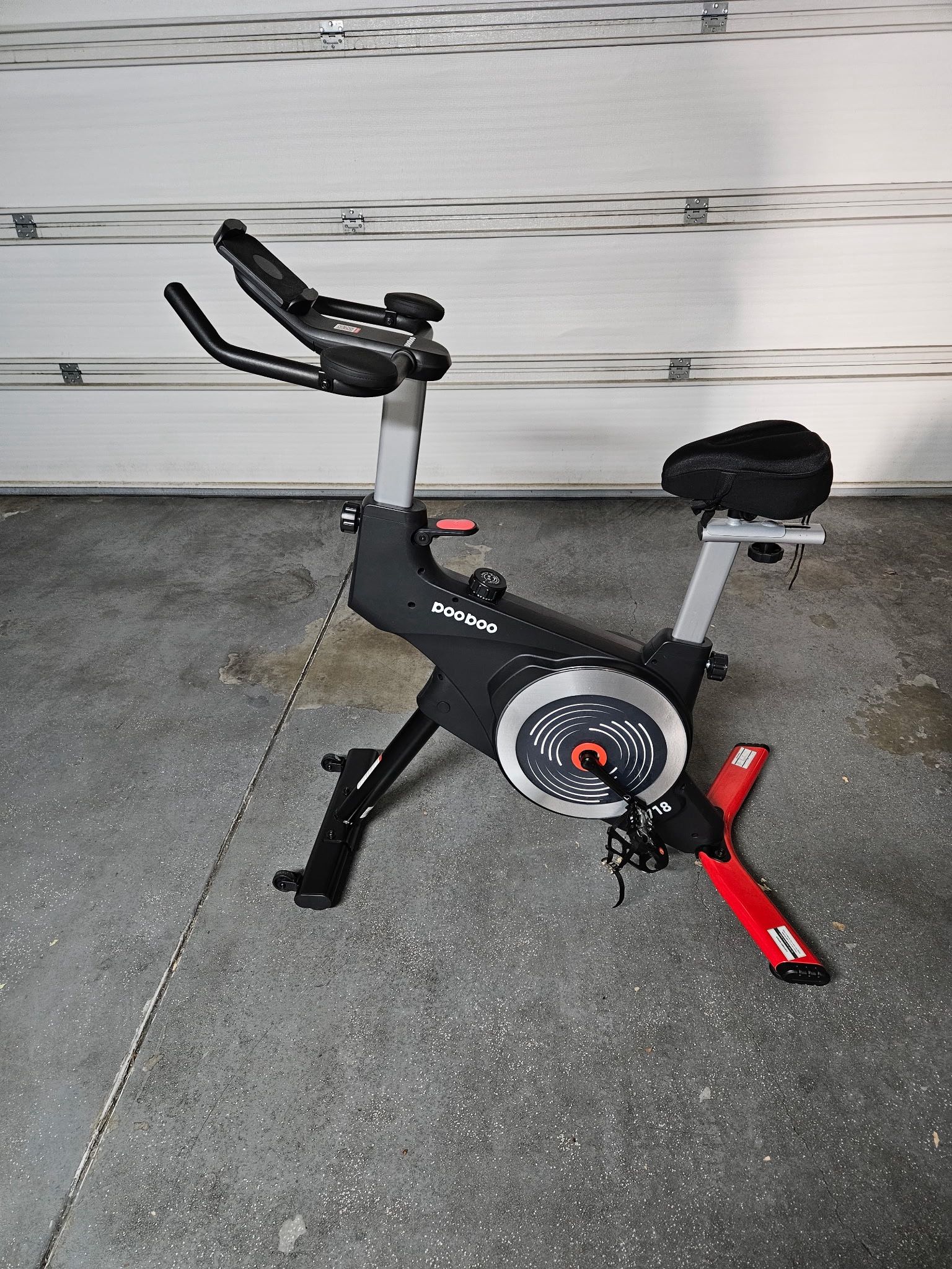High-quality stationary exercise bike for home workouts. PooBoo brand. Very quiet with a built-in Bluetooth censor allows you to connect to cycling apps. Added cushion pad to seat, like new. Max. Weight capacity is 350lbs.