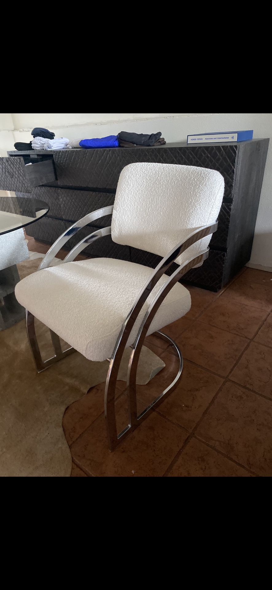 Set of 4, they are in great condition. Assuming they are from the 80s, but work well in a brutalist or mid-mod design. Very versatile! I had them reupholstered in an Italian Boucle in cream from Restoration Hardware. Feel free to source a free sample of the fabric directly from their website to get a feel for it. Non smoking home, changing my design style which is why I’m letting them go! My loss your gain. I have a baughman sofa listed too if you’re interested.