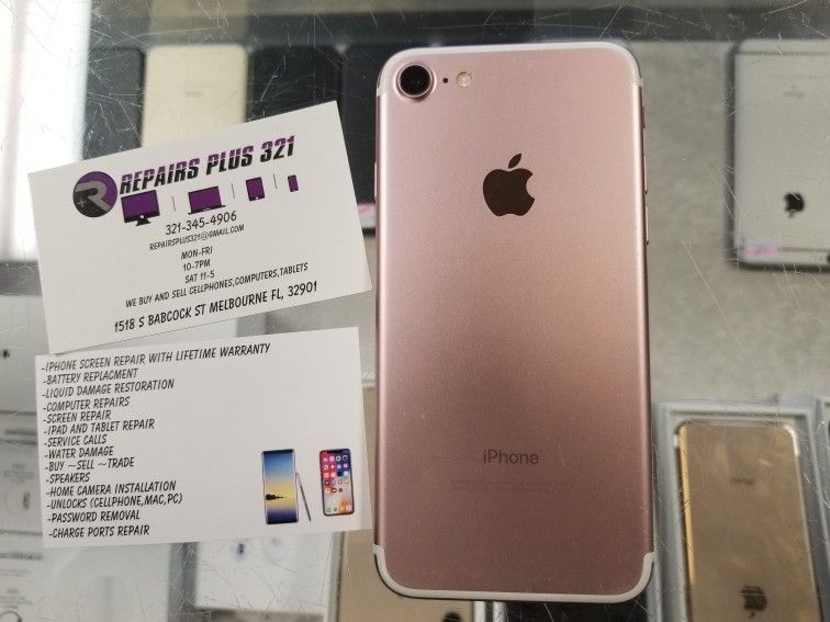 We have a rose unlocked iPhone 7 128gb for sale! It comes with a 60 Day Warranty! Charger included! We offer financing and we even give you a chance to extend the warranty to one year! Come Visit Repairs Plus 321! We have many other iPhones, Samsung, Macbooks, and Apple Watches for sale!