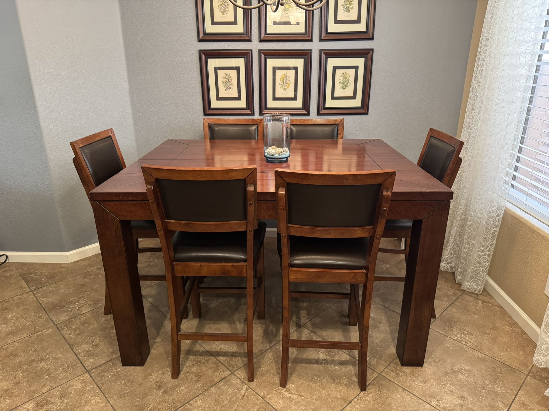 Beautiful large dining table with 6 chairs. Chairs have leather on it and comes with a long bench. Also comes with extended leaf