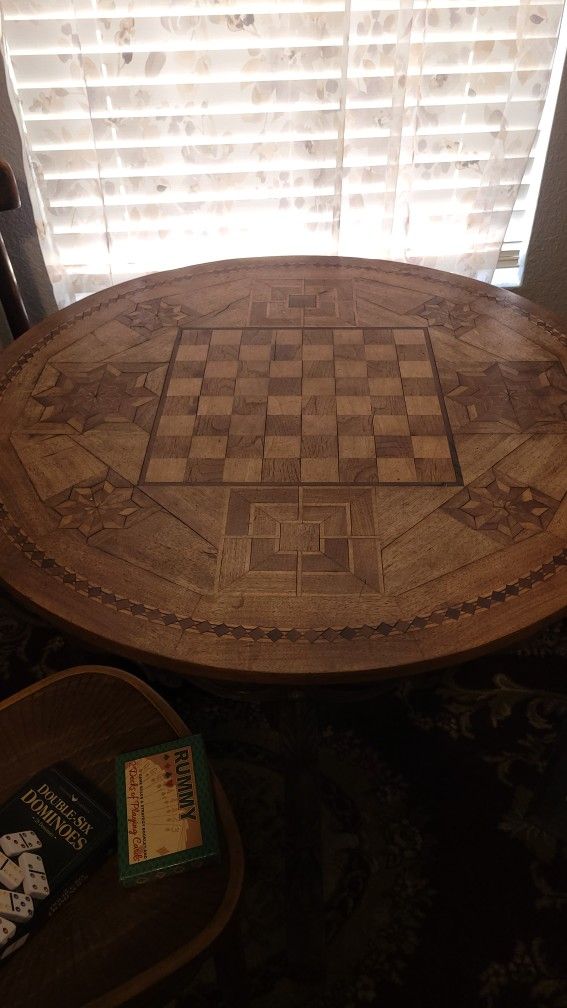 Beautiful handcrafted antique chess table and chairs. Chairs made in Poland. No identifiable markings on table.