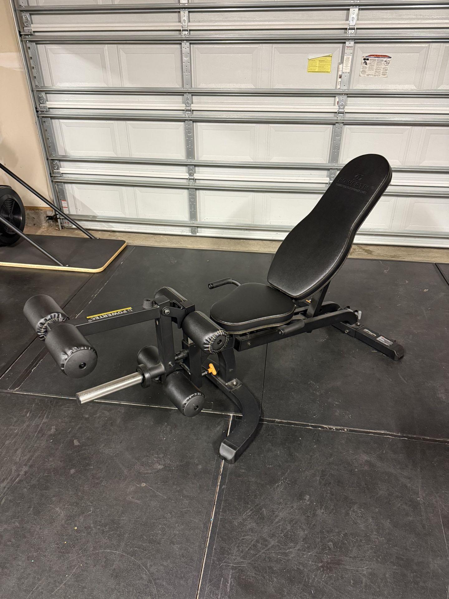 Adjustable Weight Bench w/ Leg Extension & Leg Curl Versatile adjustable weight bench with built-in leg extension and leg curl attachment, perfect for a home gym or garage gym setup. This bench allows you to perform a wide range of exercises including bench press, incline press, shoulder press, core work, leg extensions, and hamstring curls — making it great for full-body strength training. Features: • Adjustable backrest (flat, incline positions) • Built-in leg extension and leg curl attachment • Heavy-duty, stable frame • Comfortable padded support • Compatible with standard weight plates Perfect for anyone looking to build strength and add more exercise variety to their home gym. Condition: Great condition