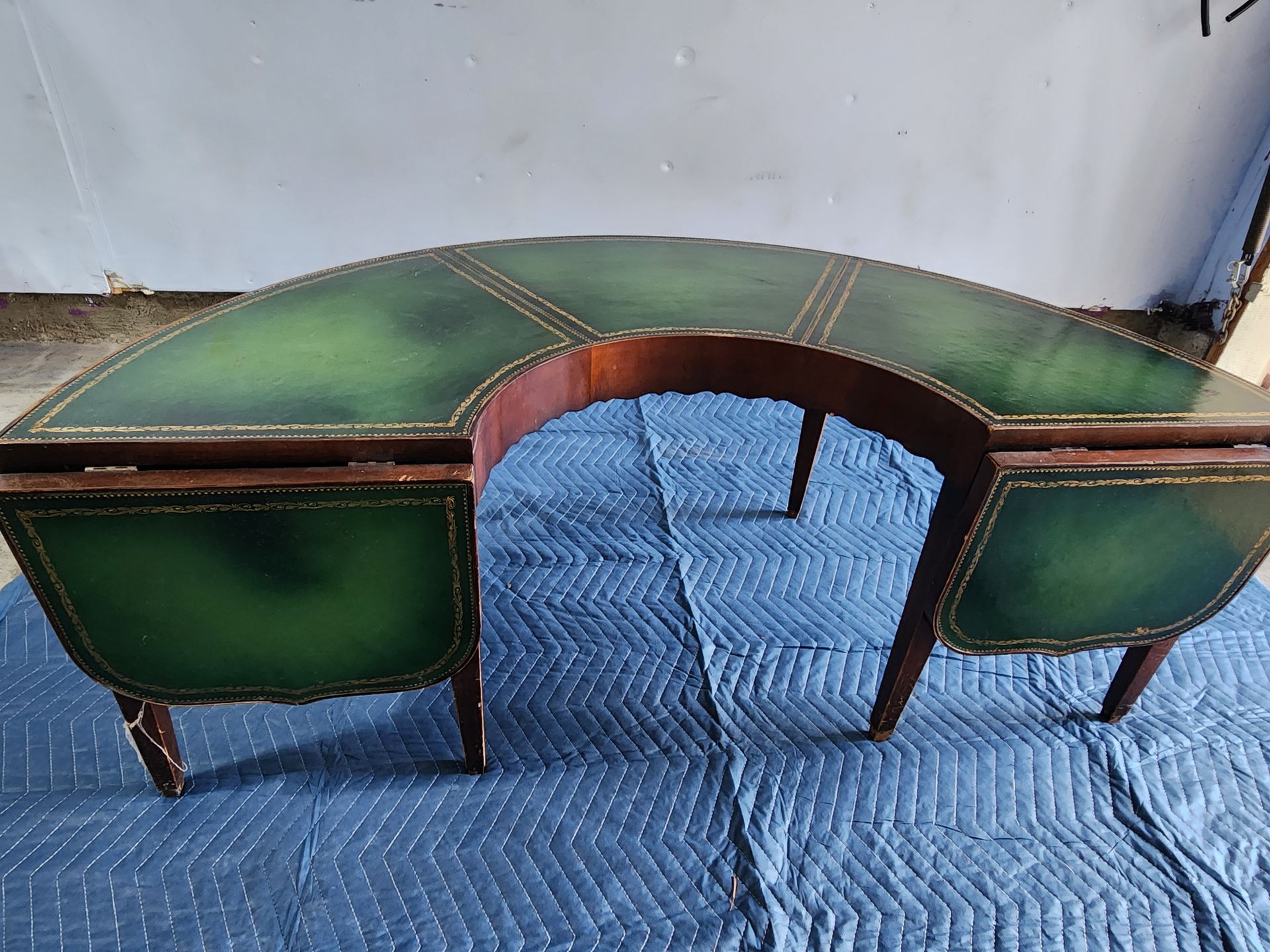 Antique gaming table with two extendable leaves. Forest green with gold trim and beautiful floral details. Not really sure how its supposed to be displayed but its such a beautiful piece. Minor imperfections on sides of table, surface is great. Formerly used as a table for my record player.