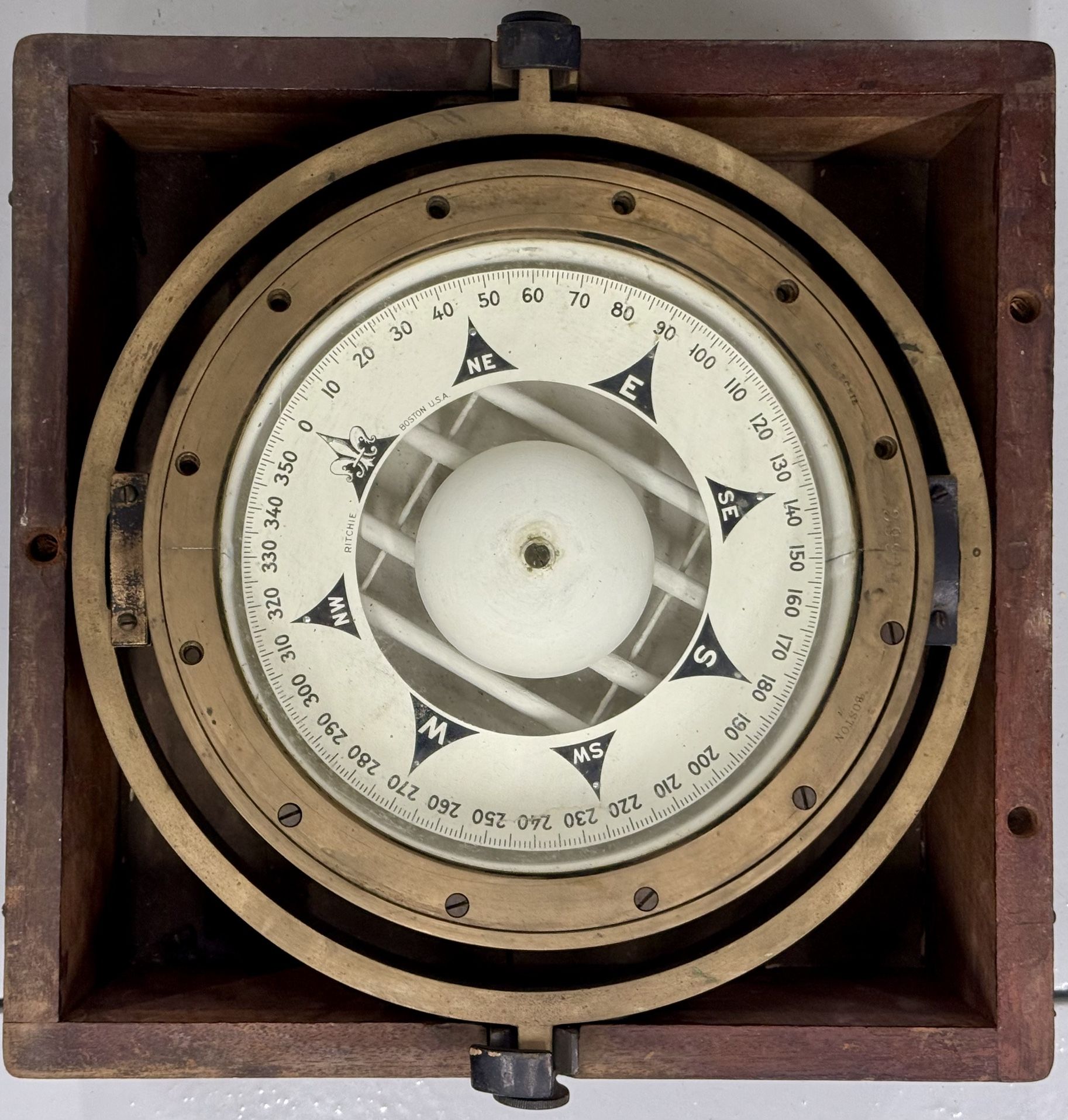 This E.S. Ritchie & Sons Boston Nautical Box Ship Compass belonged to my late father-in-law. It comes with the original wooden box. The number listed on the compass is 29914 There is also a number on the box, 5085 The box size is 13 1/2X13 1/2X 8 The glass face of the compass is 8" Cash, Zelle, cash app $350 or Best offer