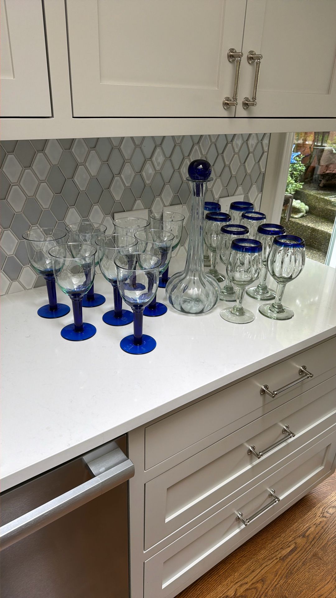 Set of 16 Mexican Glass wineglasses/water goblets. There are 8 of each style. The one goblet has a chip at the bottom as noted in the photo. Wine carafe has cobalt blue stopper.
