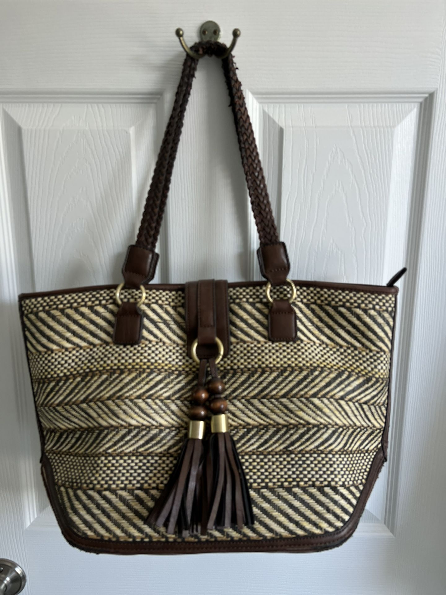 Melle Bianco bag in very good condition. Braided leather handles and fun tassels. Zipper top. 19” wide x 11” tall Price is $10. Cash only. PPU East Cobb/Roswell. Cross-posted