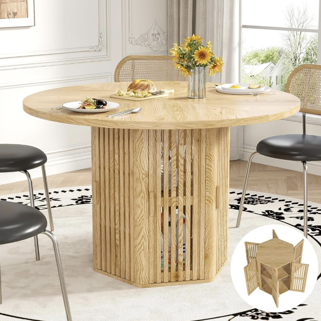 47 Inch Round Dining Table with Storage for 4-6, Boho 6 Doors Circle Kitchen Table with 2 Tier Shelf, Mid Century Modern Wooden Dinner Table