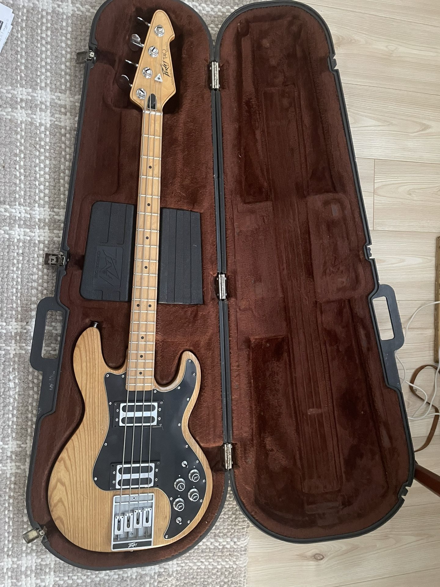 Vintage 1979 Peavey T-40 bass, made in the USA. Serial # 00344568. This is Peavey’s legendary first bass. It is known for its powerful tone, incredible versatility, and solid American build quality. Finished in natural ash with a black pickguard, and includes the original Peavey molded hard case. Early USA T-40s are becoming more collectible. Condition: • Vintage • Straight neck, plays well • Electronics work properly • Original pickups and hardware • Normal cosmetic wear for age (see photos) • Original hard case included Details: • Made in USA • Natural ash body • Maple neck and fingerboard • Dual humbuckers • Passive electronics with coil-tap tone controls • Location: Local pickup • Payment: Cash If the listing is up, it’s available. Serious inquiries only. Price: $1,150 Price reflects the age and current market value.