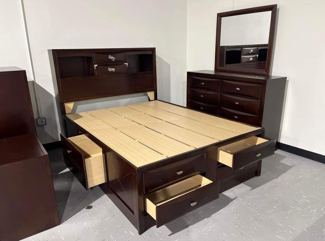 EMILY DARK CHERRY STORAGE PLATFORM BEDROOM SET (Queen Bed, Dresser, Mirror, Nightstand)