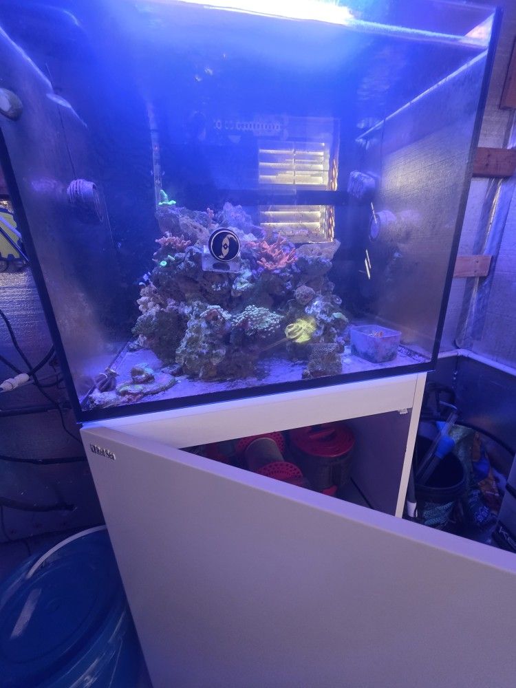 Red Sea 170 its running with corals and a few fish. Aquarium has been running for less than 2 years. Livestock: 30 pounds of live rock about half is shelf rock. A few sps corals, montipora, a couple Crayola chalices, about 10 heads of gold hammer, holy grail micromusa. Couple chromis and 2 midnight ocelaris clown fish and scopas tang. Equipment: Red Sea roller mat and extra roller Red Sea skimmer Return pump ATO Some testing equipment also. Couple heaters 5 gallon bucket of salt new unopened 4 bulb ati fixture Lmk price is firm
