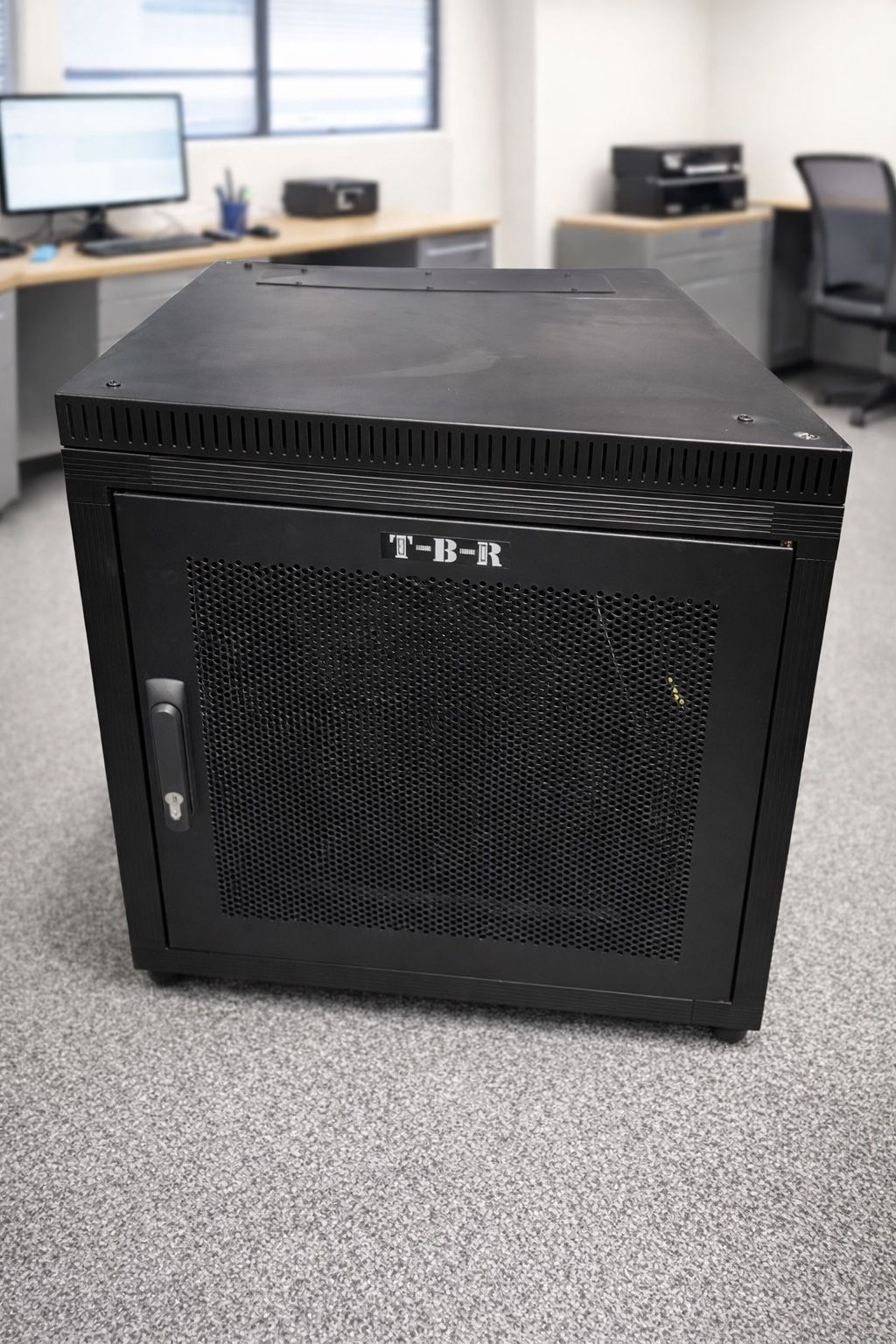 Server Rack / Network Cabinet – Heavy Duty – Locking Door Heavy-duty server / network rack cabinet in good condition. Ideal for servers, switches, patch panels, NVR/DVR systems, or a home lab. • Server Rack / Network Cabinet – Heavy Duty – Locking Door Locking perforated front door (key included) • Solid steel construction • Ventilated for airflow • Clean and sturdy • Brand: TBR (see badge) Approx. Dimensions: • Width: ~32” • Depth: ~23–24” • Height: ~30–31” Color: Black Condition: Used, good condition, normal cosmetic wear Pickup: Local pickup only (heavy) “Perfect size for small offices, closets, or under-desk server setups.”