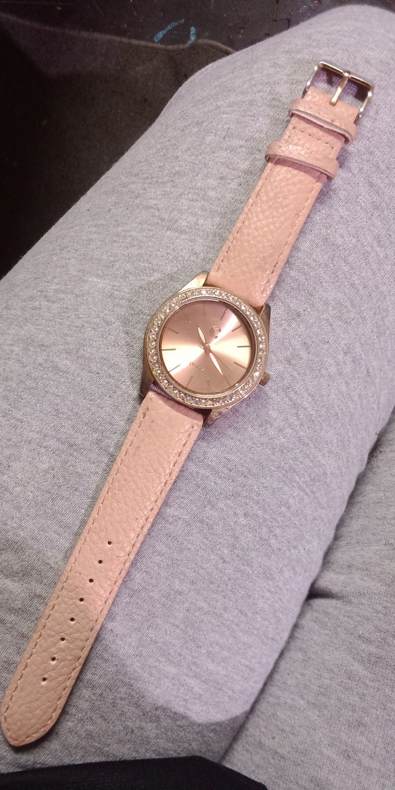 Charming Charlie rose Gold toned woman's watch with pink leather band never been worn band is in immaculate cond rvaes'asr no creases at all.