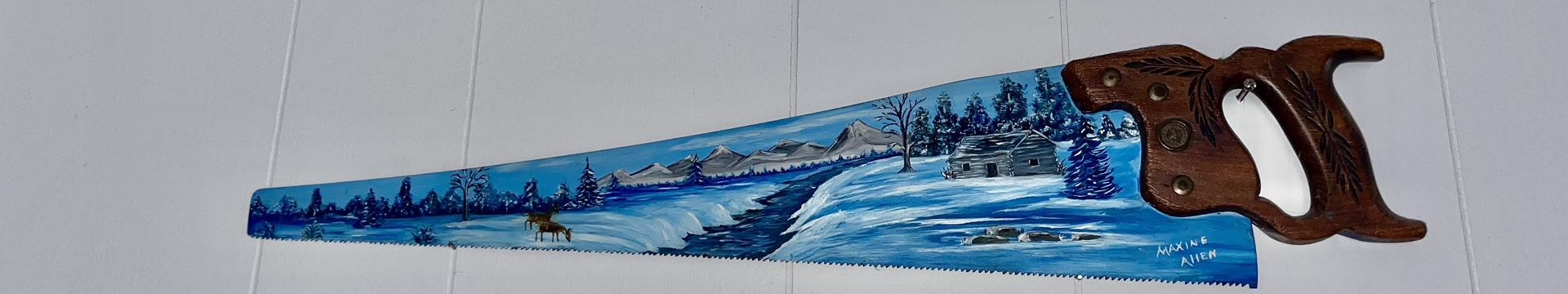 Late 1800’s Vintage Warranted Superior hand saw featuring a beautifully hand-painted winter scene by artist Maxine Allen. This one of a kind piece blends classic craftsmanship with folk art charm. Original maker’s mark visible, with age-appropriate patina that adds character. Perfect for rustic, farmhouse, or cabin décor, or for a collector of painted tools and vintage art. Best offer considered — serious inquiries only.