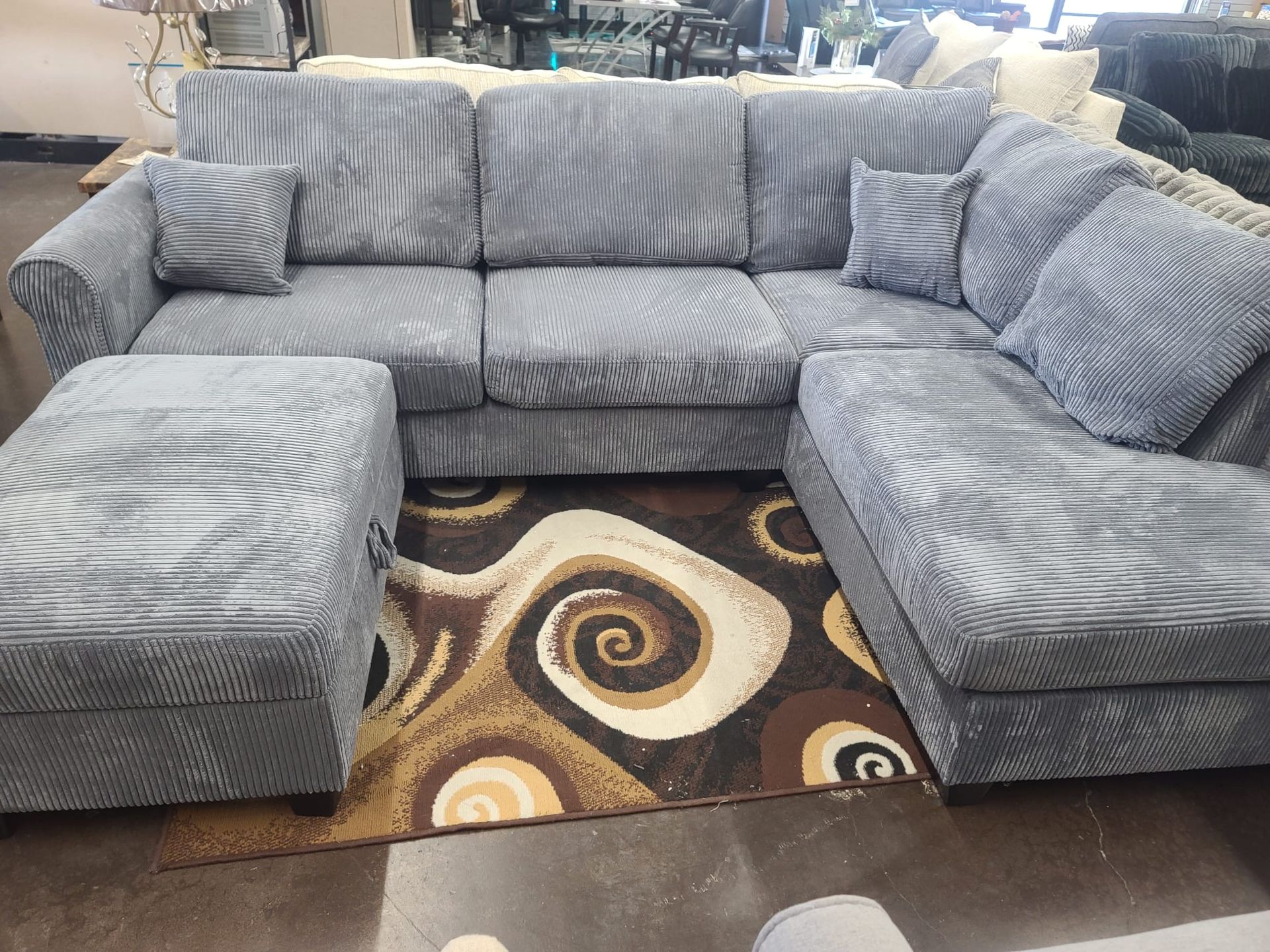 Comes with storage ottoman, accent pillows, usb charging port. 106" x 76"