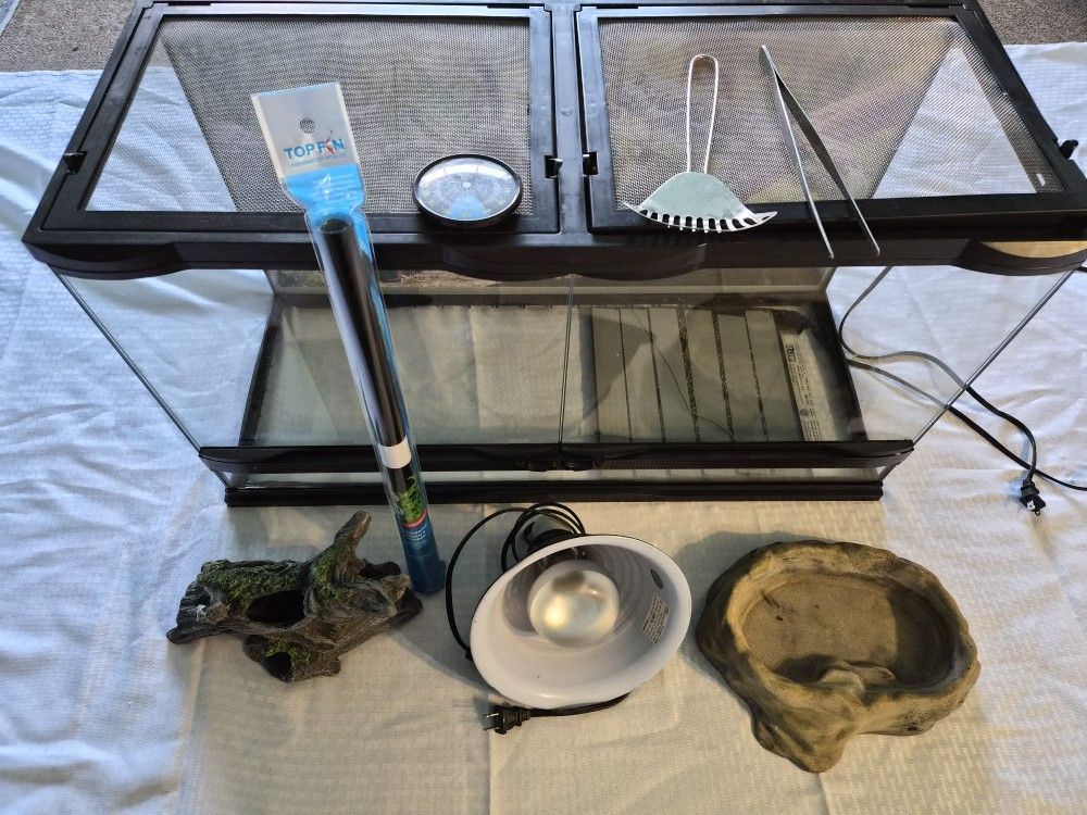 Lamp Heating pad Hiding tree Water bowl Thermometer Scooper Tongs Background sticker