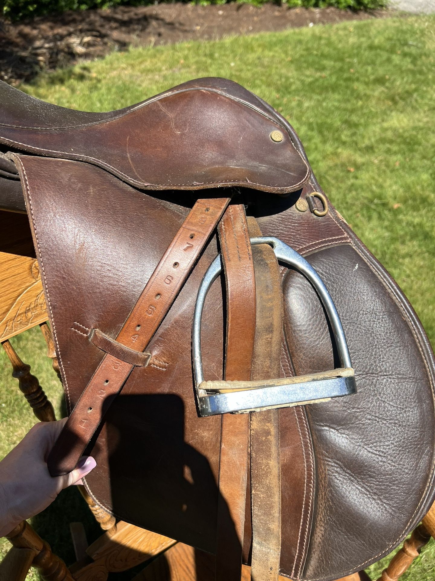 Incredibly comfortable English saddle. Needs leather conditioning but is a great saddle. Used it on my 15 l+ hand Arabian jumper.