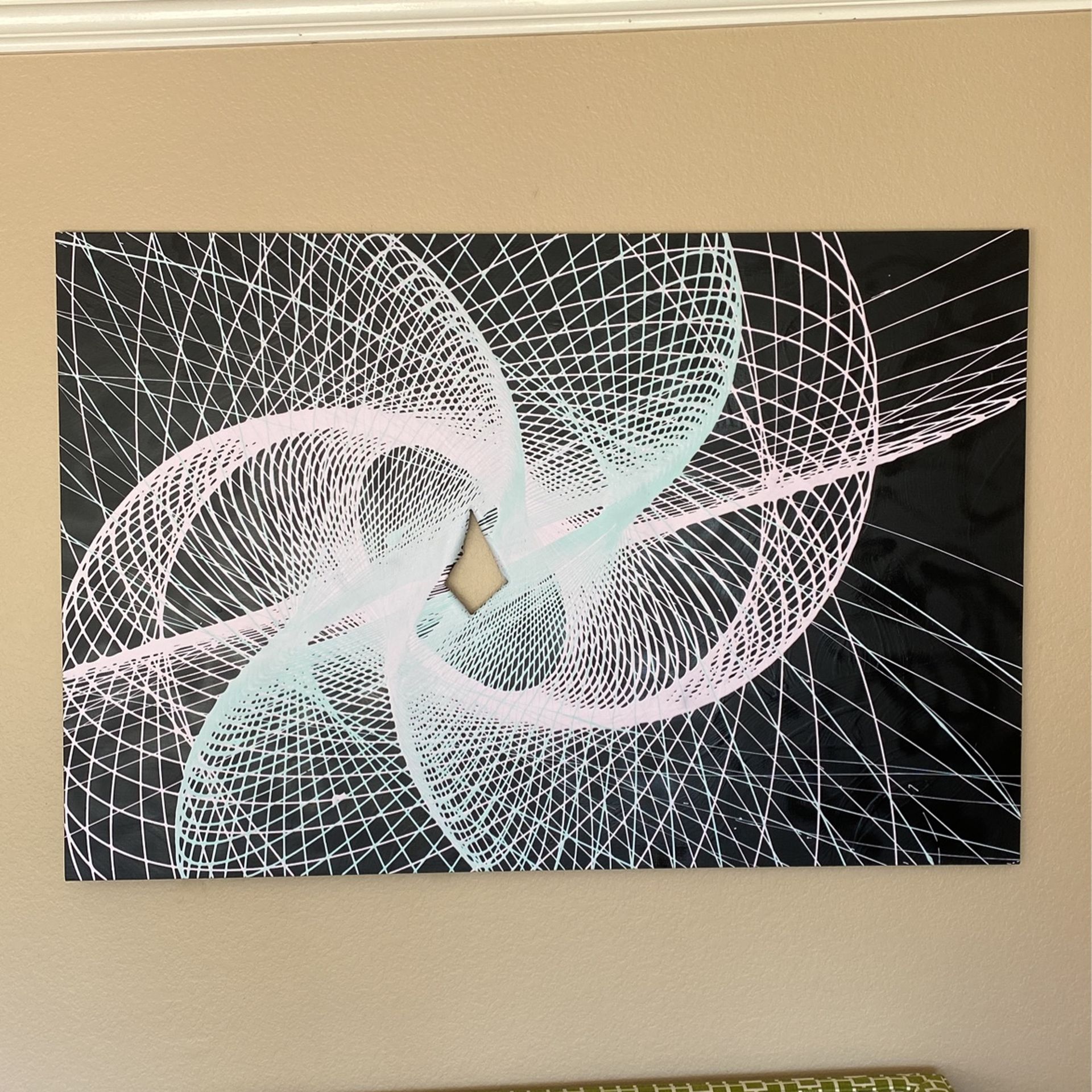 Contemporary abstract pendulum painting on large 60in x 38in canvas with a hole in the middle. Mixed media art artwork painting