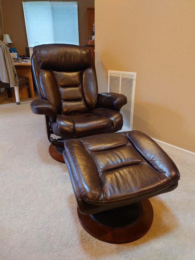 -Hardwood and walnut finish with top grain leather upholstery (rich deep brown color). -Chair swivels and reclines. -Chair base diameter 25" and ottoman 19" -Leather has few scratches but no tears or rips. -Hardwood on chair has no scratches. Hardwood on ottoman has one scratch on the inside of arch and is in photo. Must pickup in Kenmore.