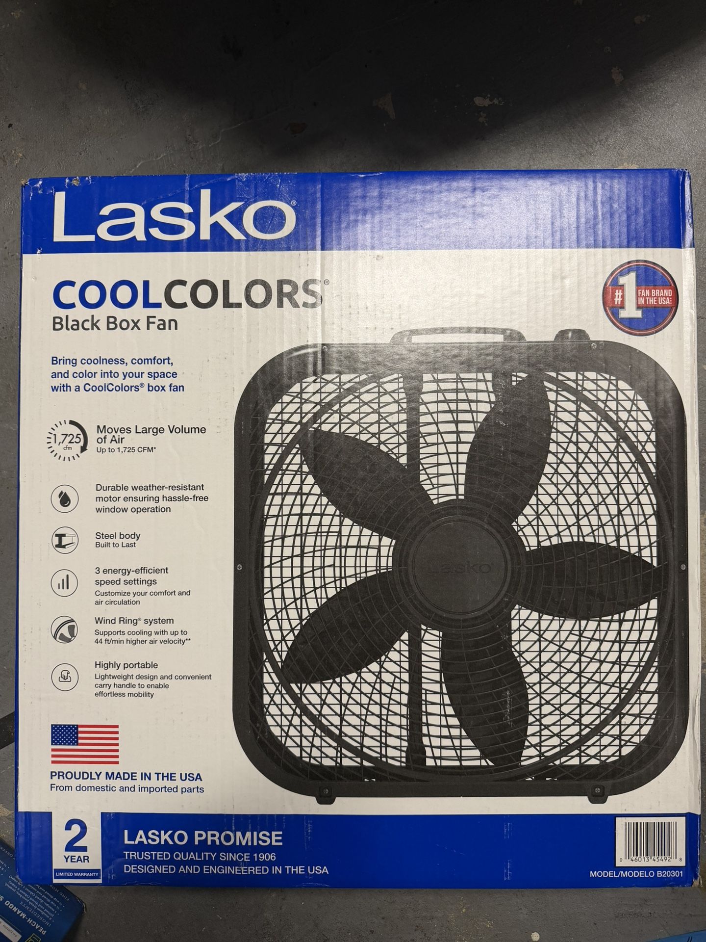 Brand new Lasko Cool Colors 20-inch box fan, open box but never used. Still in original packaging. Powerful airflow with up to 1,725 CFM, perfect for cooling rooms fast. Features 3 speed settings, durable steel body, and a lightweight design with a carry handle so you can move it anywhere easily. Great for home, office, garage, or window use. Tested and fully working. No damage, just opened box.