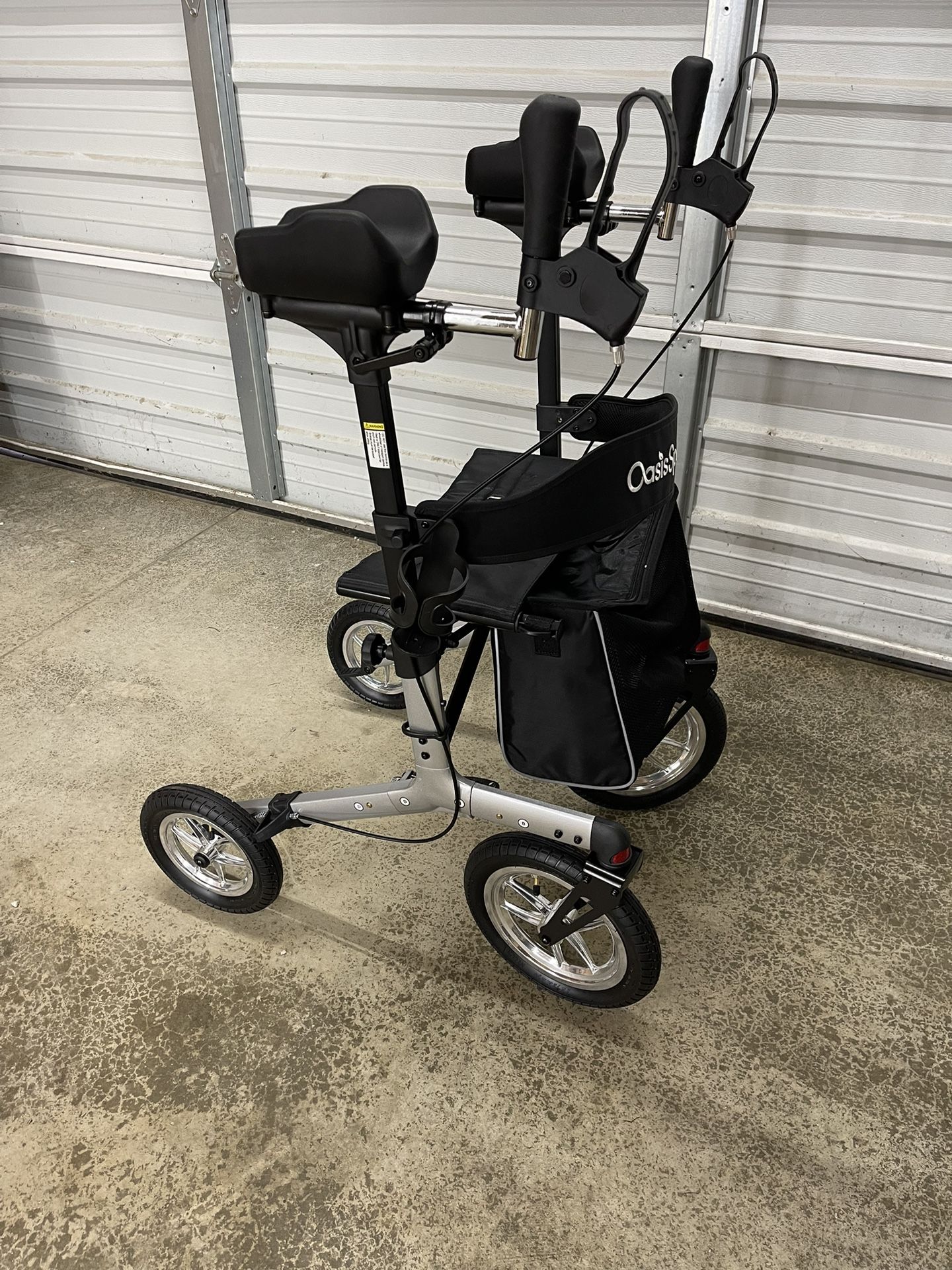 NEW assembled 300LBS Capacity Upright Walker with pneumatic all terrain air tires Retails for $255 To walk further and longer, we need to stop and take a rest now and then. For a better rest, we equipped this all terrain upright walker with a wider seat of 17.7 (L) x 9.8" (W). As a part of the seat, the backrest is also thickened with soft foam. What makes an all terrain upright walker? The answer lies in pneumatic tires. They enable an upright walker to go over sidewalk cracks and rocky areas like riding on air! The smaller rear wheels (10"; 12" for the front ones) also help maneuver in tight spaces. The ergonomic locking handbrake helps lock this walker in place. You can also position the angle and distance of the brake levers so your hands can always stay at a comfortable height.