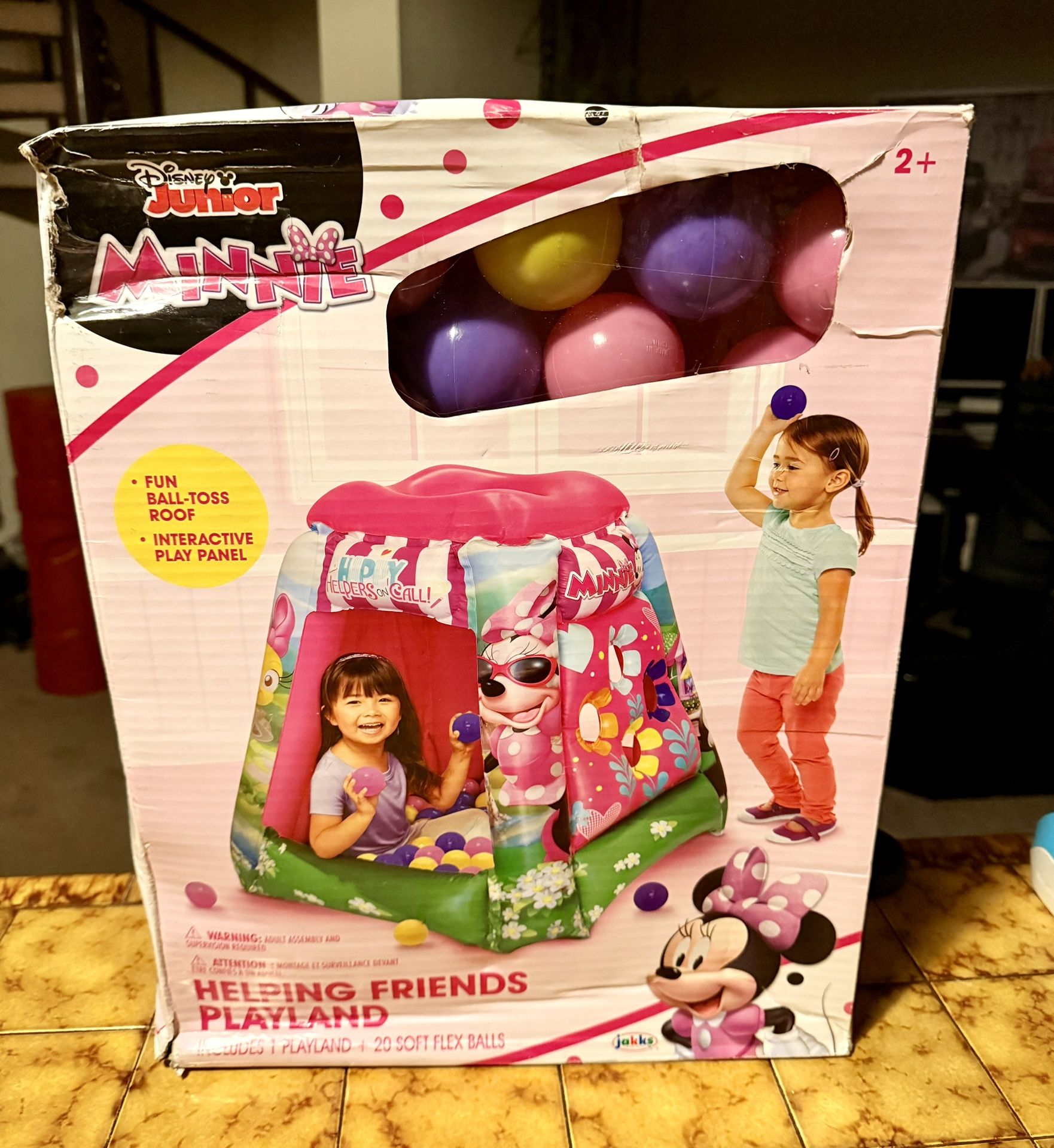 Disney Junior Minnie Mouse Helping Friends PlayLand. Includes 20 soft flex balls. Fun ball-toss roof and interactive play panel. New, box damaged a little(depicted in pictures) from storing it . Last 2 pictures are examples of what it sells for . Must Pick Up.