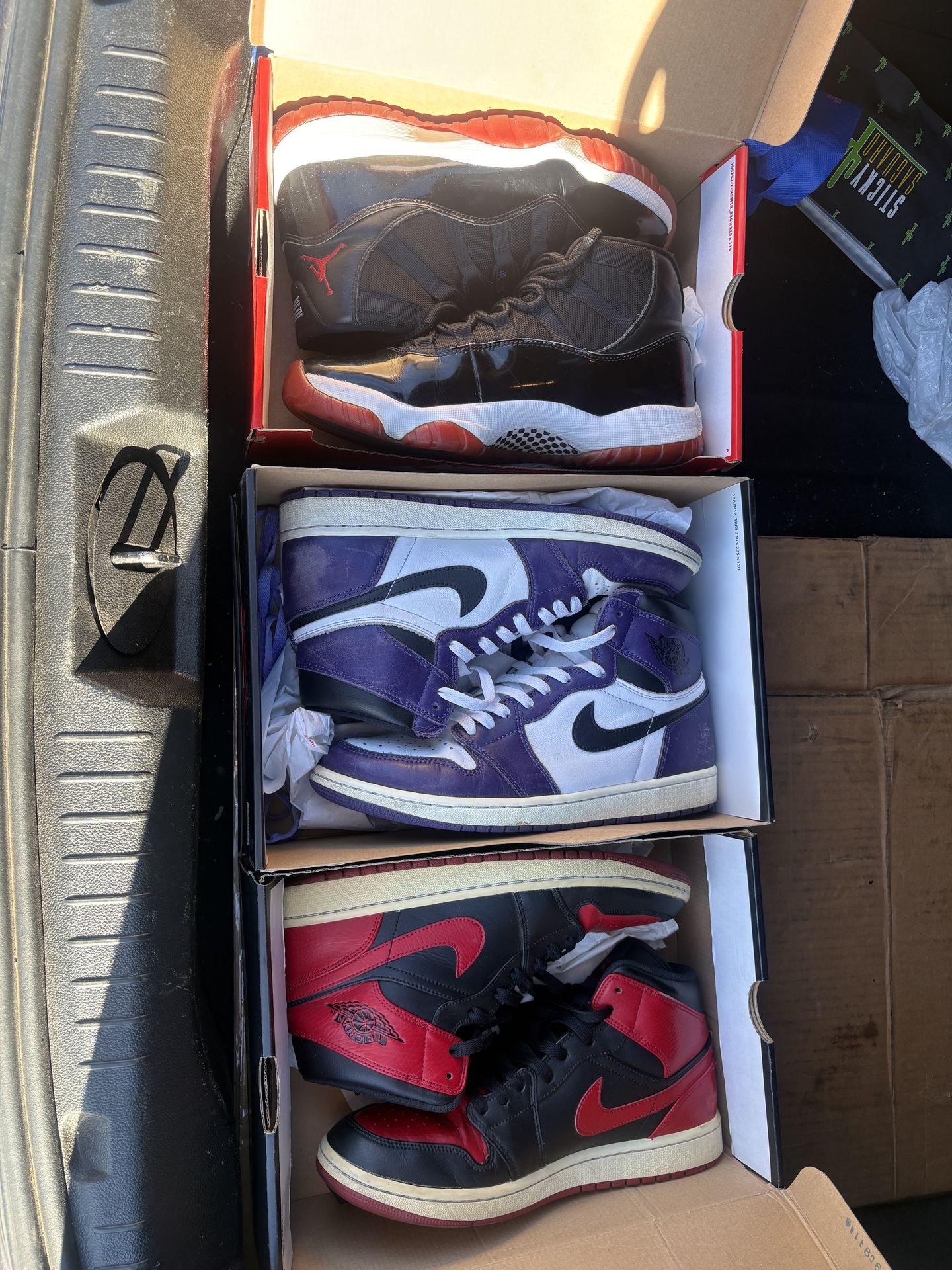 Three pairs of jordan’s for sale, all size 10.5: Jordan 11 Breds Jordan 1 Court Purple 2.0 Jordan 1 Mid Banned all shoes are equally worn, but good beaters. $100 for all three, sold as-is