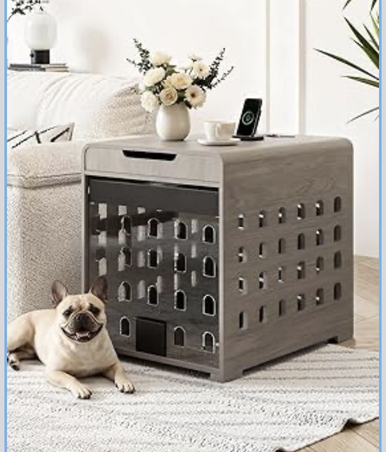 Modern Dog Crate Furniture with Charging Station Medium Kennel Indoor with Flip-up Hidden Acrylic Door for Small and Medium Breeds up to 50lb Wood Pet