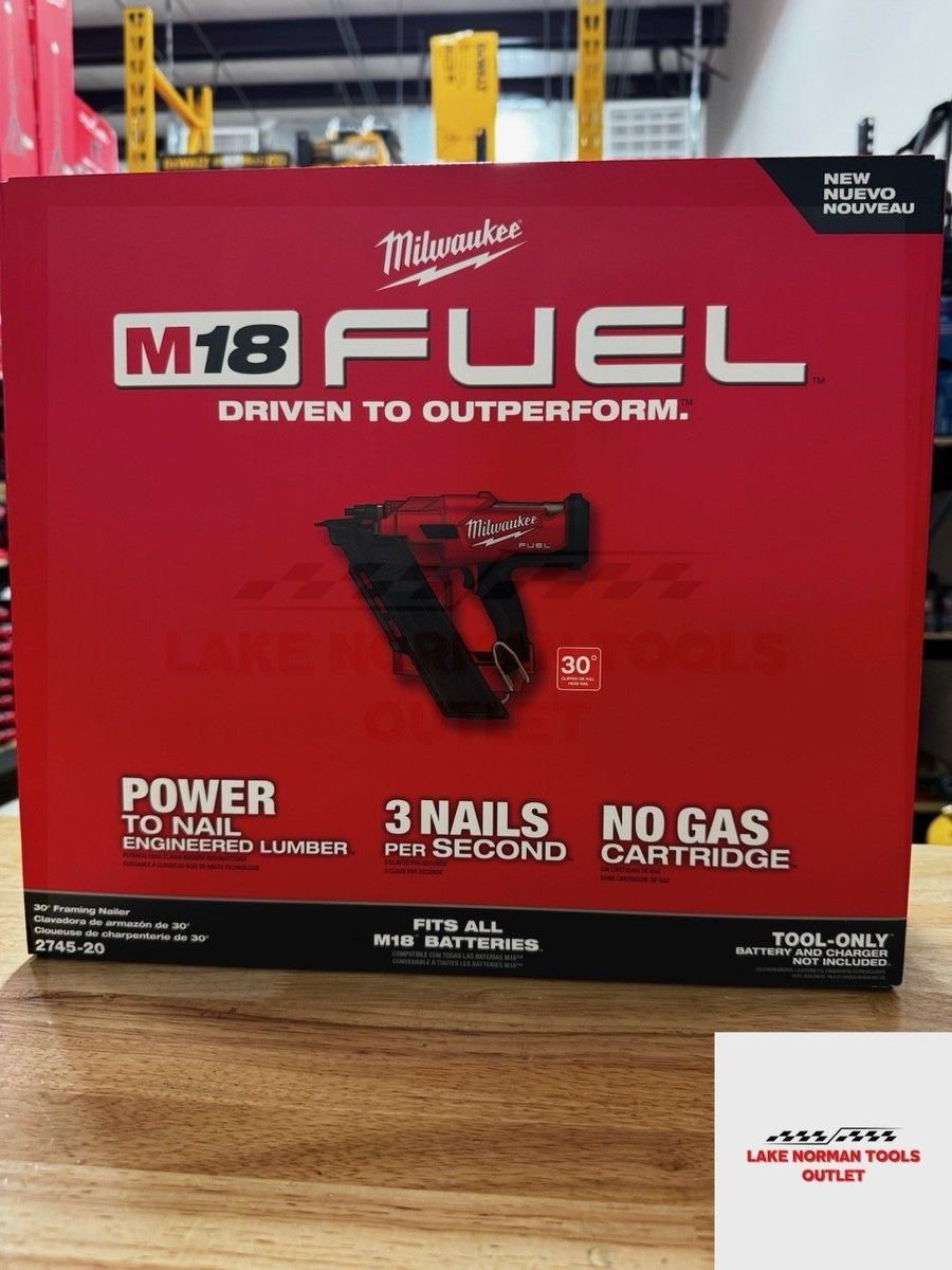 This is a Milwaukee M18 FUEL 30-Degree Framing Nailer, model number 2745-20. Model: 2745-20 Angle: 30-degree, accepting 30-34 degree clipped or full offset head nails Nail Compatibility: Drives 2" to 3-1/2" nails into dense engineered lumber Power Source: 18-Volt M18 REDLITHIUM battery (eliminates need for air compressors or fuel cells) Features: Noted for its reliable, jam-free operation, efficient battery use, and integrated rafter hook