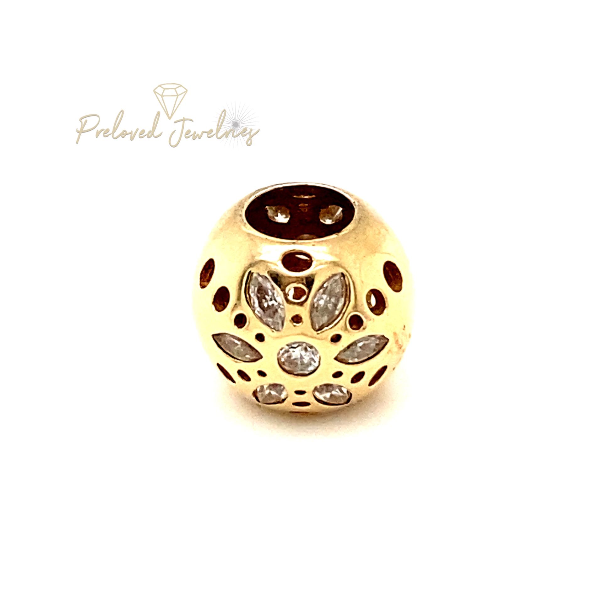 SPECIFICATIONS: Metal/ Gold Karat: 14k Yellow Gold Metal Stamp: G585 ALE Condition: Preowned Authentic Pandora Flower Cz Charm. This piece is retired and hard to find. No Pandora packaging included. Note: Pictures are enlarged to show fine details of the product.