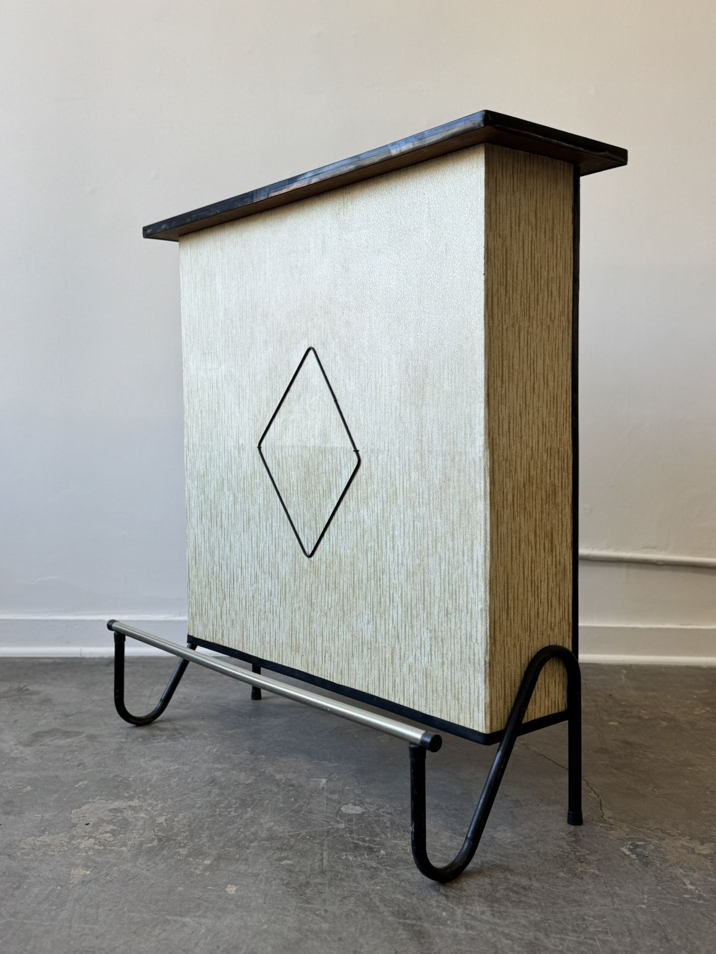 Dynamite 1950’s free standing bar here ready to party! Very excited to get this one into a home because it is awesome. Storage in the back and a foot rest at the bottom as well as a Formica top and Naugahyde on the front. It is in good vintage condition with some wear on top and patina on the chrome. Really a unique piece that doesn’t come around too often! . 36” W x 16” D x 39” H . $550