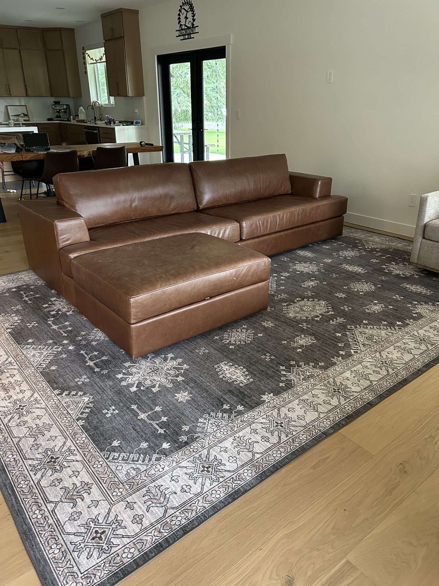 All information In photos 114 inches long ottoman with storage custom made delivered while we were still building now that we have it in the space I am looking for a sectional and different shaped sofa to face a different direction. Buffalo leather purchased from interior define pecan color delivered in November. Subtotal was $6040.00 all receipts and measurements in photos from order.