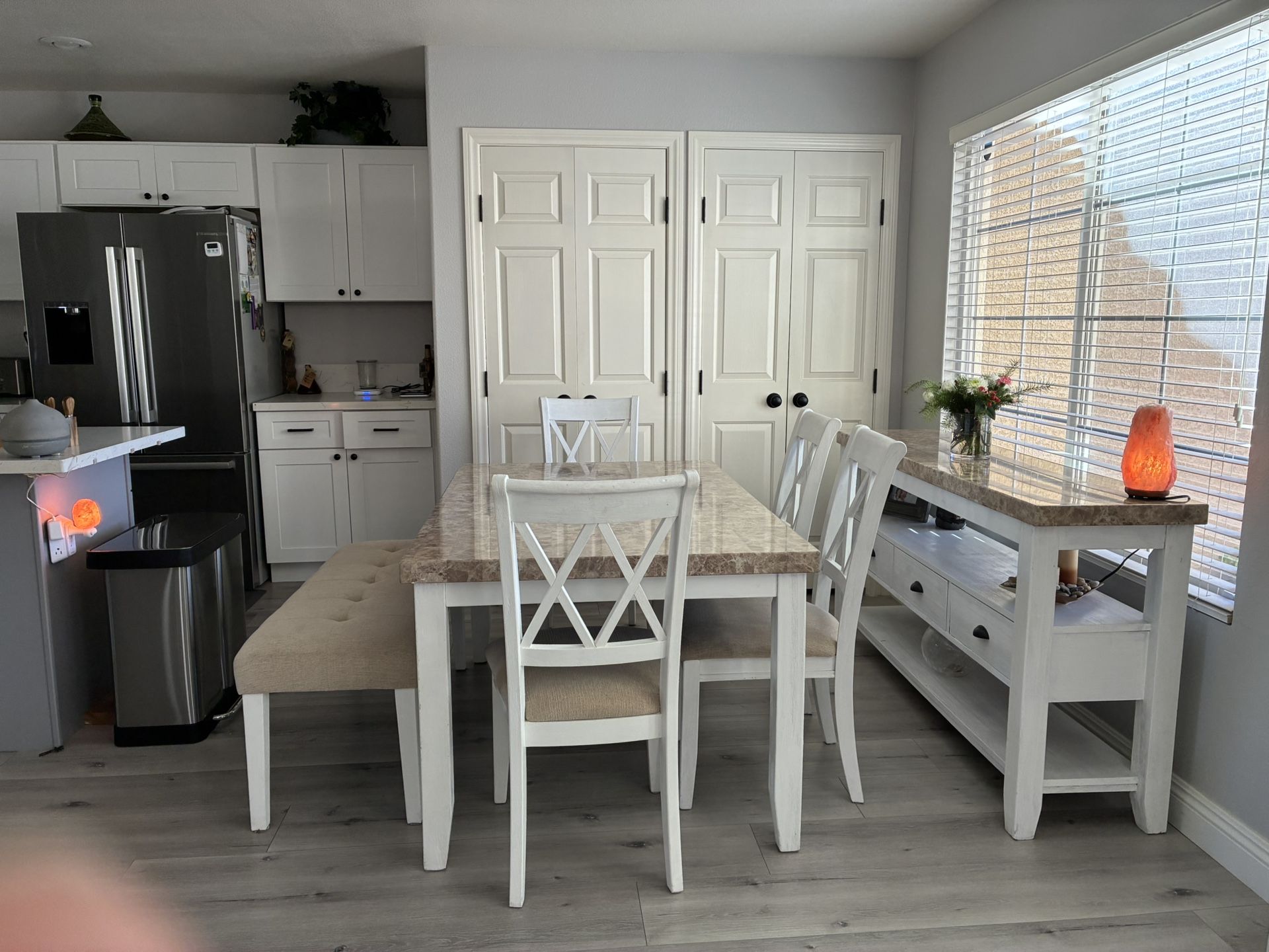 Nice table set with four chairs and bench with armoire. Good condition. Willing to sell it without the armoire if necessary.