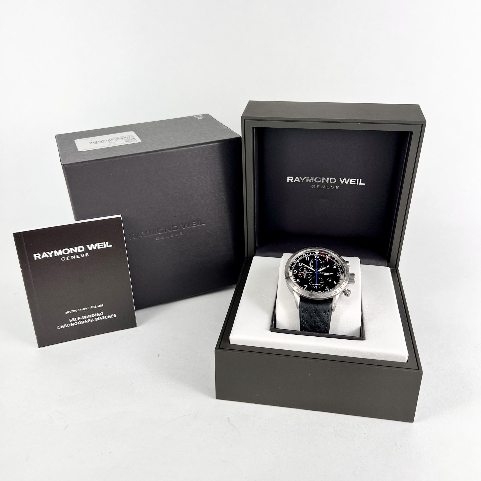 Raymond Weil Freelancer Piper Automatic GMT Chrono 7754-K459121 Includes everything seen in first photo Specifications: Case Size: 45mm Case Thickness: 14mm Lug to Lug: 52mm Band: Will fit about an 8'' wrist