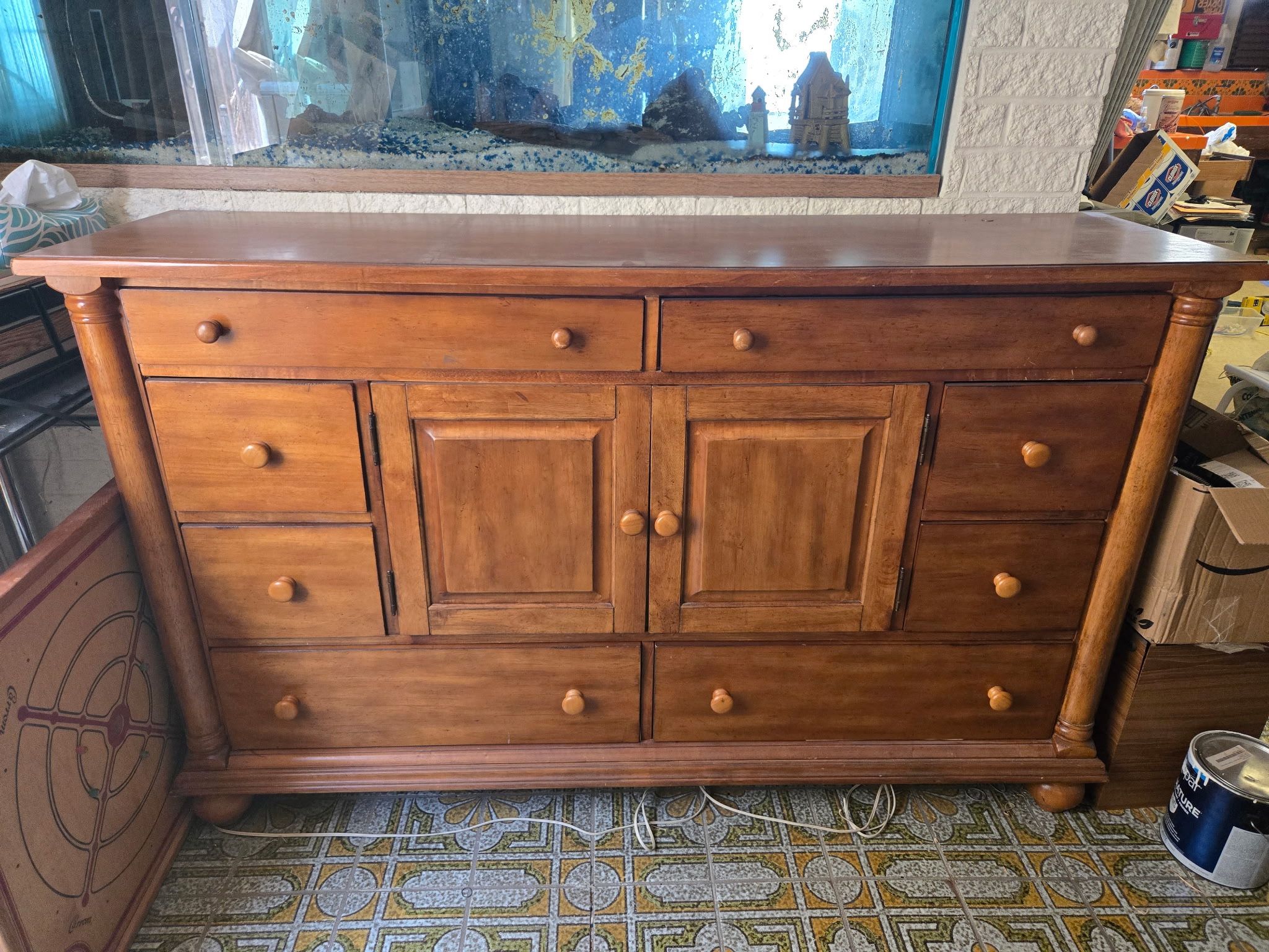 This is a sturdy, solid wood dresser with 9 drawers and 2 center cabinets for extra storage. The piece features a warm medium oak finish with wood knobs and classic rounded column details on each side. Perfect for bedrooms, guest rooms, or even as a TV stand with storage. • Dimensions: 65” W x 17” D x 41” H • Well-built and very heavy – not particleboard or cheap materials • All drawers open and close smoothly • Has some wear consistent with age but still in great shape • From a smoke-free home Great for those who appreciate quality vintage or rustic-style furniture.