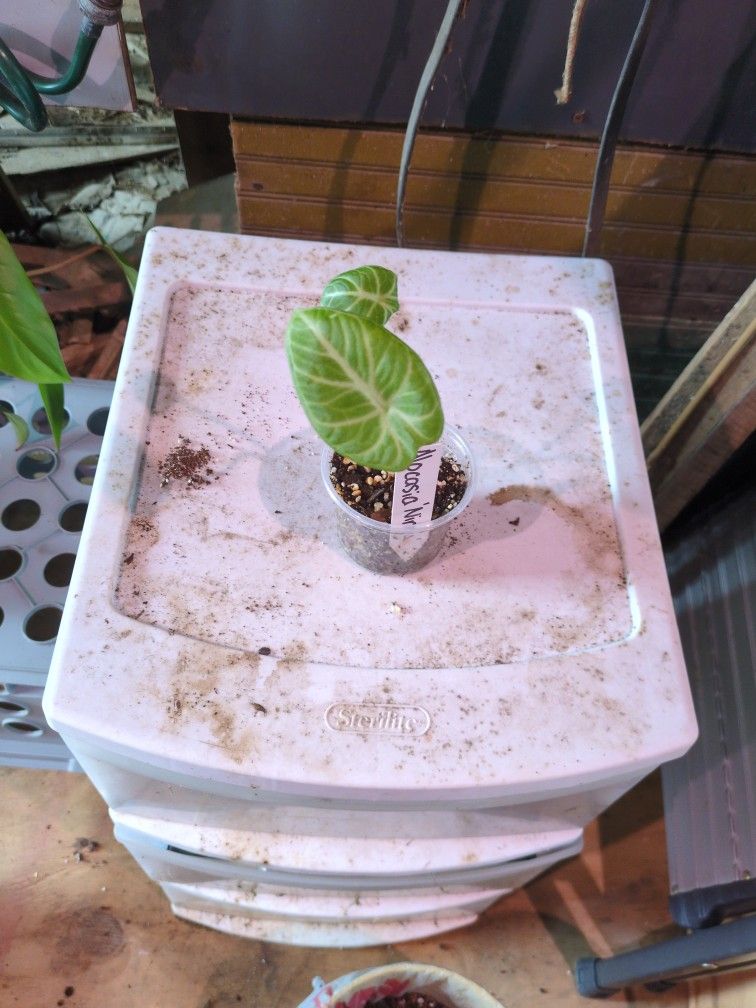 Juvenile Alocasia Ninja, come in the clear pot with chunky soil mix. High humidity plant great for greenhouses, cabinets and cloches.