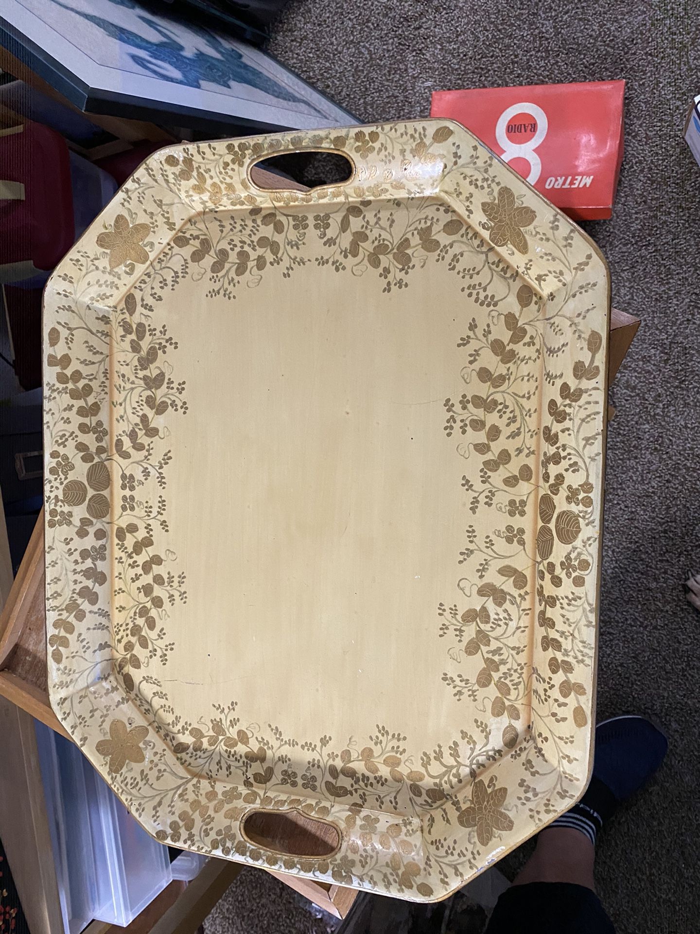 Likely over 100 years old. Hand painted metal serving tray with handles.
